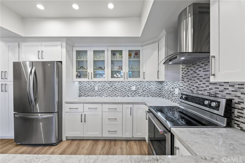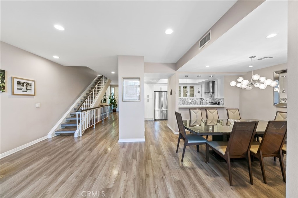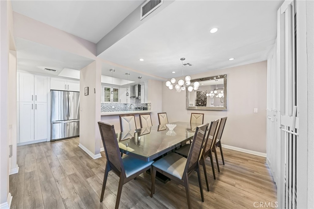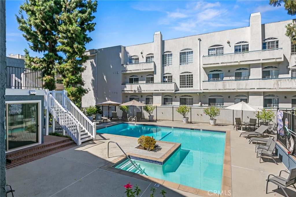 An immaculately remodeled corner unit townhome awaits one very lucky buyer in Encino. As you approach the entrance you notice the high level of care that goes into this complex. From the hardscaping to the lush, mature landscaping and the sparkling pool and spa facilities, nothing is overlooked. Upon entering the grand double door entrance, you are welcomed by gleaming wood-like floors, smooth ceilings and recessed lights throughout. The formal entry leads to a spacious living room with a soaring two-story ceiling and wall to wall and floor to ceiling windows filling the home with natural light. The large wrap-around patio is accessible from multiple places and offers outdoor seating from both the living and dining areas. The gas fireplace with colored glass and custom stonework is ideal for romantic evenings and makes the perfect backdrop for dinner parties which can be enjoyed in the adjoining dining room which flows to the open concept kitchen and wet bar. The kitchen features white shaker style cabinets, stainless steel appliances and quartz counters with glass and stone backsplash. The downstairs level also features one bedroom and a remodeled bathroom with custom stonework on the floors and walls, frameless glass shower enclosure and floating vanity. A set of stairs leads directly to the garage from inside the home directly to two side-by-side spaces. Upstairs you will find the laundry area, bedroom with remodeled en-suite bathroom and mirrored closet, and a very spacious master bedroom with soaring, vaulted ceiling, an abundance of natural light, walk-in closet with built in shelving and master bath with spa tub and separate walk-in shower, all behind double frosted glass doors, as well as a second private patio. Other amenities include recreation room and guest parking, and the HOA includes earthquake insurance.