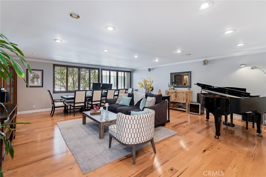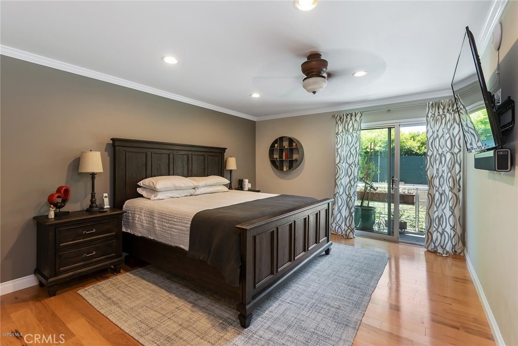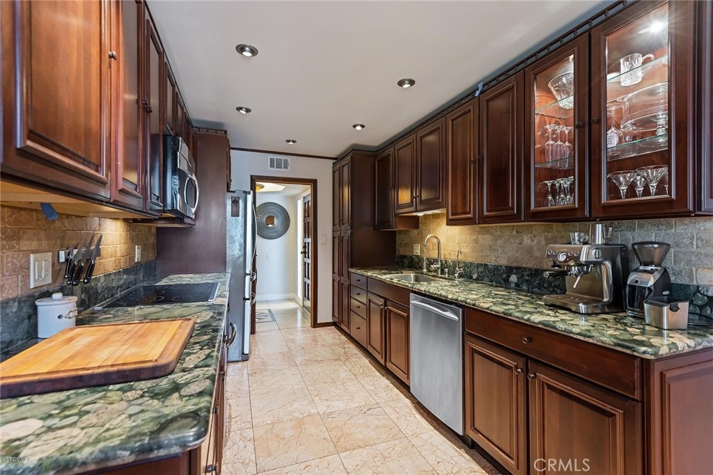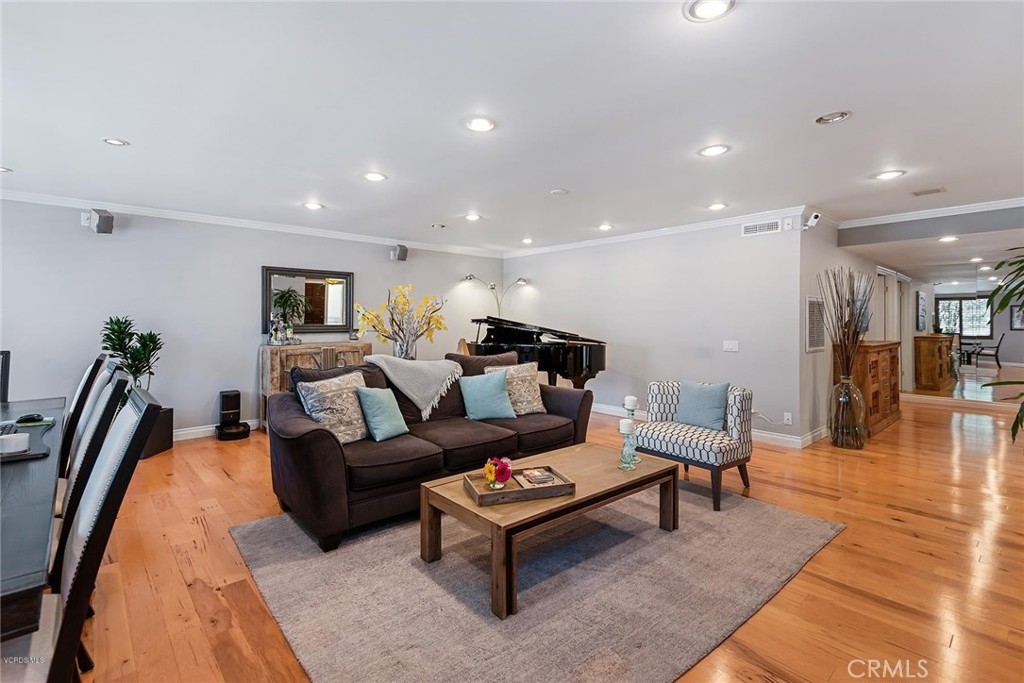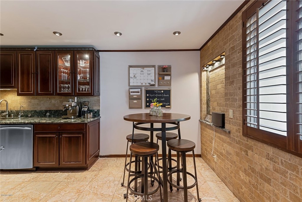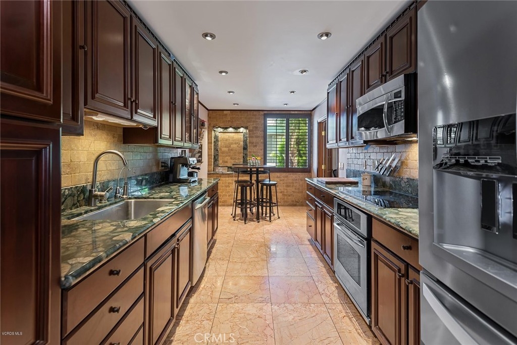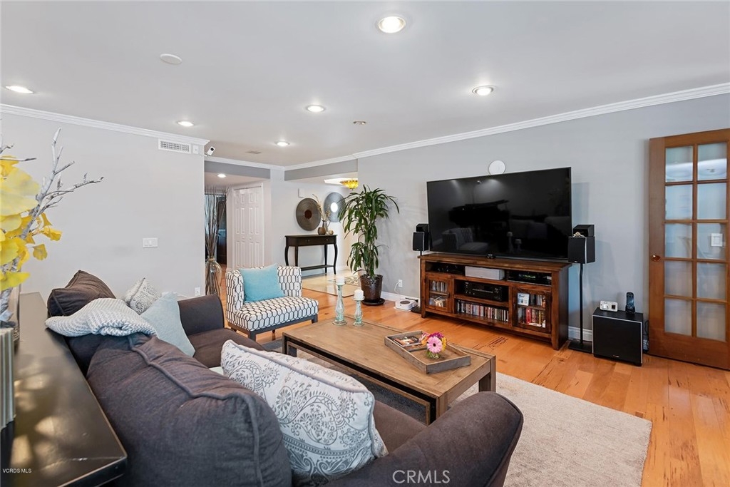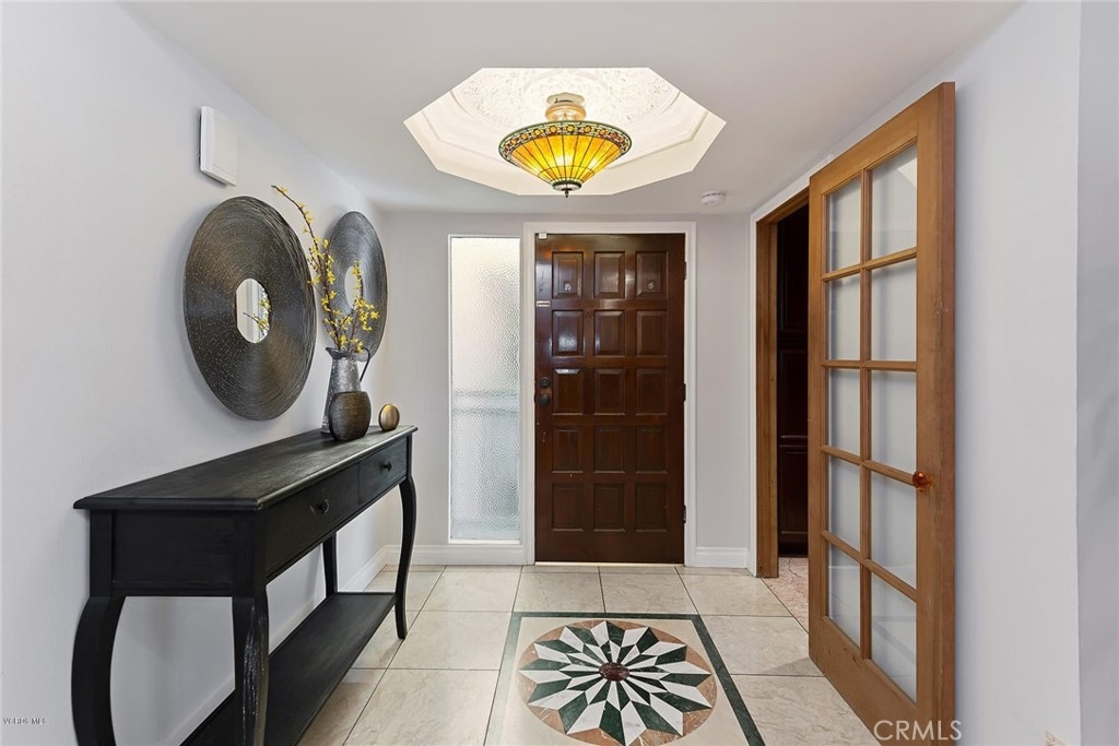 This beautifully upgraded upper unit features 3 bedrooms and 2 bathrooms, offering both comfort and style. The gourmet kitchen is a standout, with custom cabinets, granite countertops, and a stunning travertine backsplash. High-end stainless steel appliances complement the cozy breakfast nook. Throughout the unit, you'll find exquisite stone and hardwood flooring, adding warmth and character to the space. The living and dining areas flow seamlessly, highlighted by recessed LED lighting and smooth ceilings, creating a bright and airy atmosphere. The primary suite offers dual vanities, a luxurious travertine shower, and ample closet space. Custom paint and crown molding add elegance to every room. Two additional bedrooms and a bathroom provide versatile options for use. Modern features include Cat 6 ethernet wiring, surround sound in the living room, and smart home lighting. Recent upgrades include a new HVAC system, electrical panel, and water heater. Conveniently located within the complex, enjoy access to two pools and beautifully landscaped grounds. This unit is close to Ventura Blvd., Balboa Park, Balboa Sports Complex, and the award-winning Encino Charter Elementary School. Side-by-side parking completes the package. Additionally, the living room is pre-wired for surround sound, and one room has sound insulation for an enhanced audio experience.