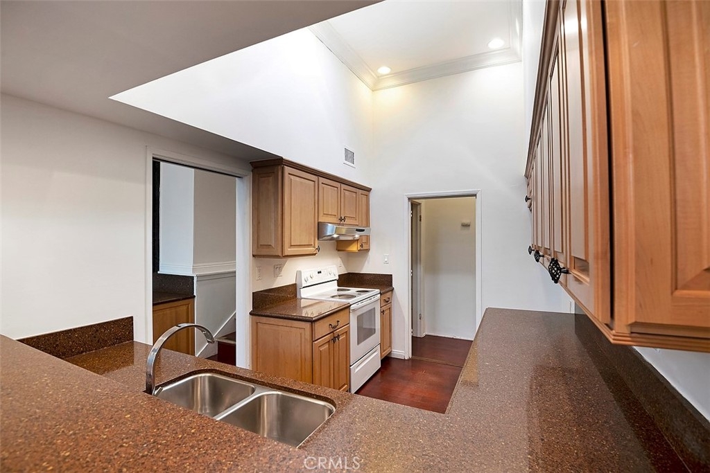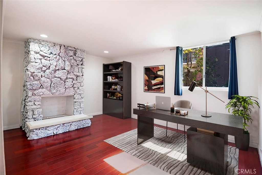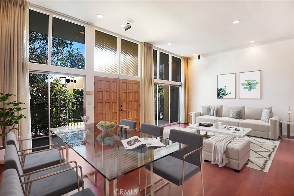 Welcome to your dream home! As you step through the double doors of this corner unit townhome, you are immediately embraced by its spacious and inviting ambiance. This high-ceiling two-story residence is uniquely positioned with no neighbors above or below, ensuring maximum privacy and tranquility. This townhouse is a haven of contemporary living in the heart of Encino. The only shared wall is in the kitchen and dining room, ensuring the bedroom walls are not shared. The home is bathed in natural light, courtesy of a skylight in the kitchen and impressive floor-to-ceiling windows. Hardwood flooring flows seamlessly throughout, leading you to the large living room adorned with a striking marble floor-to-ceiling fireplace that extends to the second room that is adjacent from the primary bedroom. The kitchen is a masterpiece of modern design, updated with granite countertops and featuring a breakfast bar that opens to a formal dining area. This layout overlooks the living room, creating an ideal setting for entertaining guests. Built-in central vacuum system with inlets in most of rooms throughout the entire unit for your convenience. Ascend about 5 steps to the upper level to find the sleeping quarters. The master bedroom is a luxurious en-suite, while the second bedroom is serviced by an updated bathroom. Descending from the kitchen, you'll discover a private laundry room, adding to the convenience of this layout. An attached 2-car garage provides easy and private access to your home. This townhome's location is unbeatable, just blocks from the 101 freeway and the trendy dining and shopping of Ventura Blvd. Residents can enjoy community amenities such as a pool & spa, shower rooms, and a meeting room. Don't miss out on the opportunity to make this exceptional townhome your new residence.