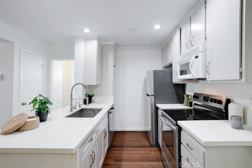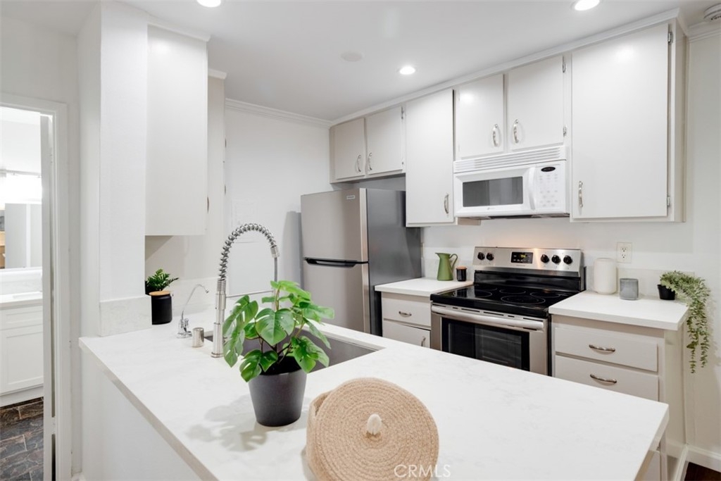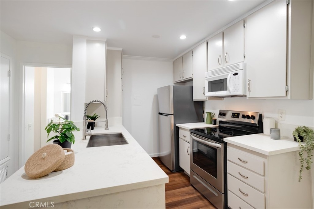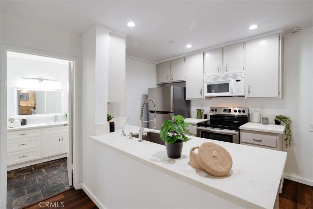 Fall in LOVE with Encino Oaks living! This 2 bedroom / 2 bathroom / 990 sq ft condo boasts a functional, well designed floor plan that feels warm & bright, featuring consistent floors throughout, abundant natural light, and dual bedroom suites. An updated kitchen includes refreshed cabinets, contemporary countertops, oversized, under counter mounted sink & matching stainless steel appliance suite. A spacious open concept living & dining room with sliding glass door offers access to a shared courtyard patio for seamless indoor / outdoor entertaining. Each of the two bedroom suites offer generous closets, en suite bathroom options and expansive vanity counter space. Positioned in one of the most desirable locations within the building, this end corner unit offers convenience and privacy, with easy access from the 2-car covered parking (tandem) to the unit, all without stairs. The gated, pet-friendly community offers resort-like amenities, including a clubhouse, pool, gym, and tennis courts. Conveniently located south of the 101 freeway, enjoy easy access to popular spots like Trader Joe's, Ventura Blvd, fantastic dining options, and charming boutiques. Don't miss out on the opportunity to make this meticulously maintained and private condo yours! Welcome Home.