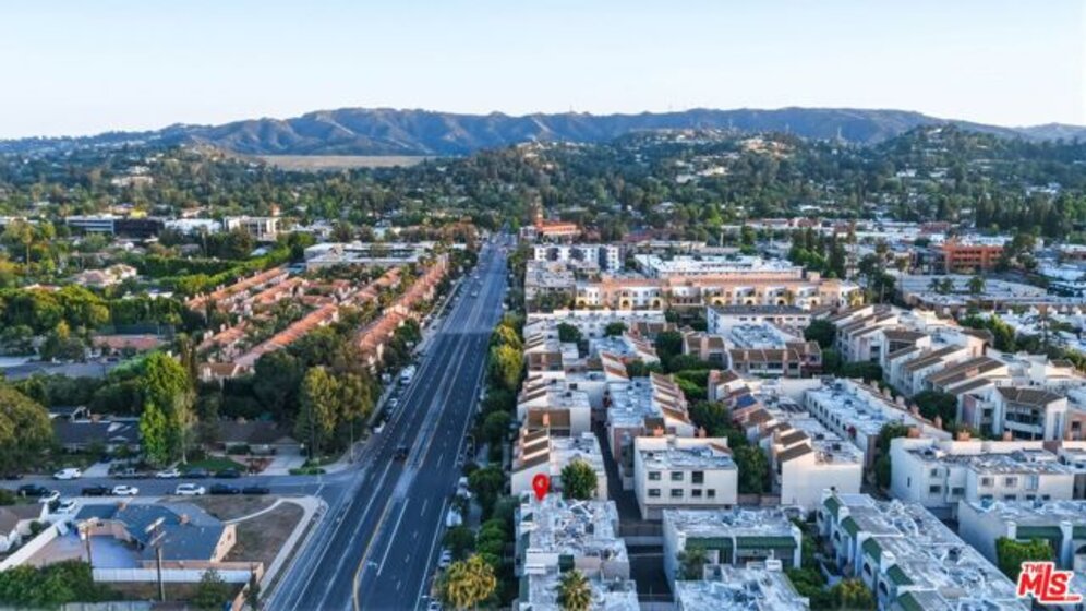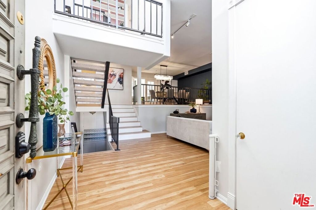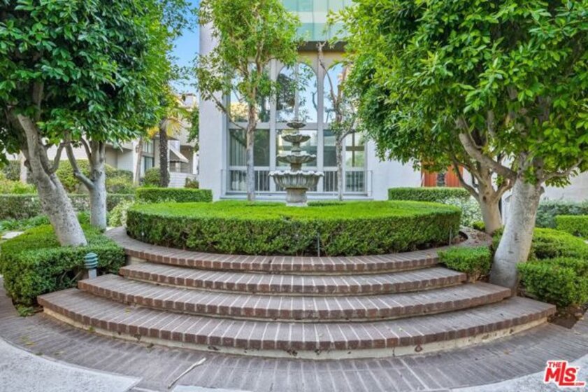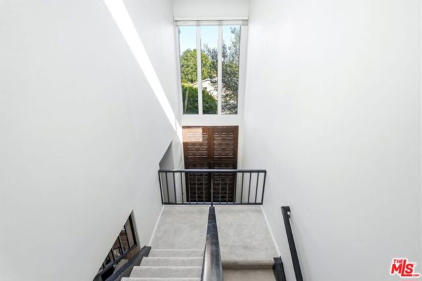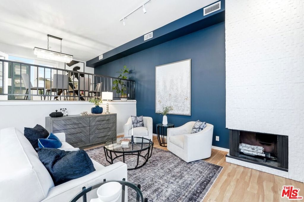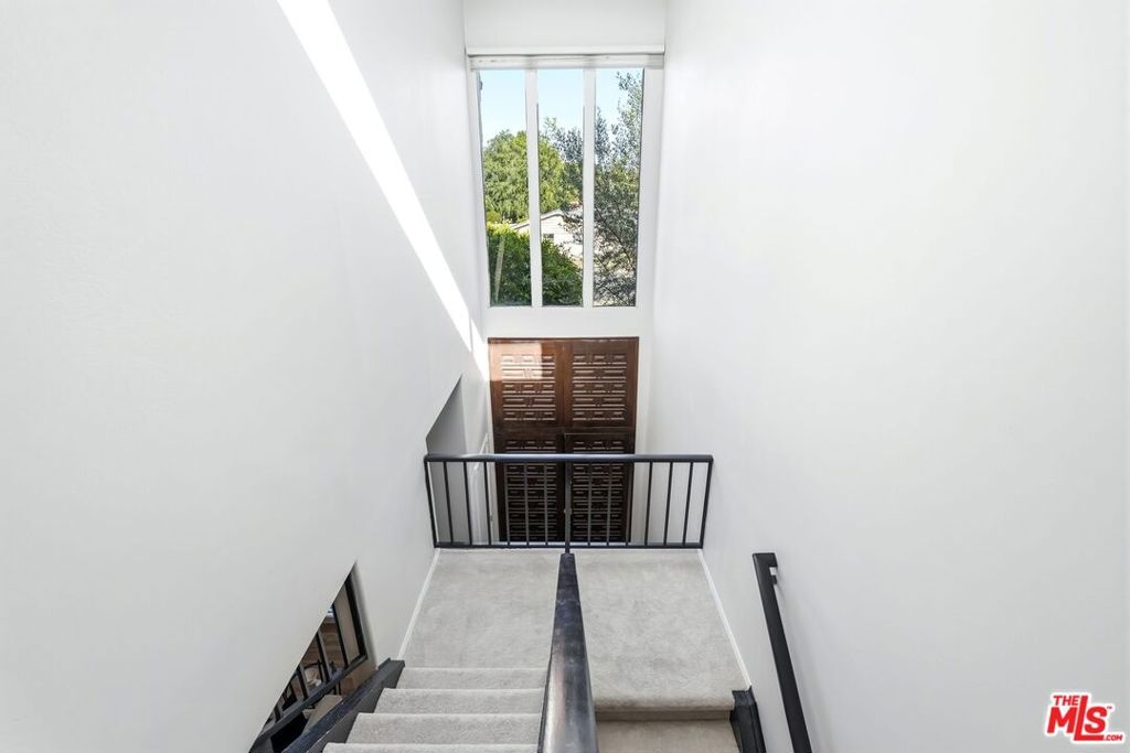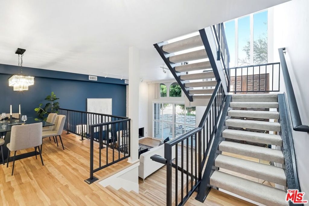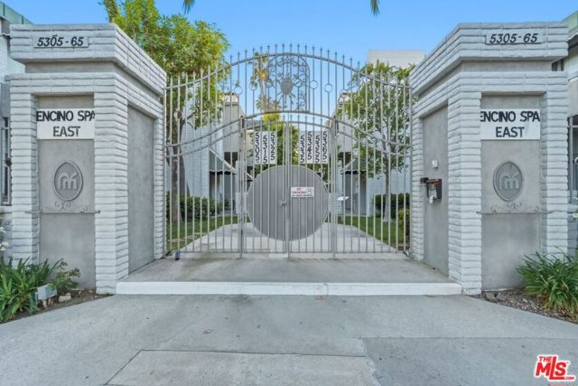 Set within a gated complex with strong architectural character, this townhouse centers on a dramatic main living space with high ceilings and a full wall of windows. A row of arched openings above brings in additional light, softening the scale of the room. The fireplace is finished in textured stone, and the open stair rises alongside it, with dark metal railings that continue through the upper level. The living room opens with ample space for multiple seating areas, centered around the fireplace and the wall of windows. Just above, the dining area sits along the edge of the space, looking down into the room below. Its position keeps it connected to the living room and works well for gatherings and entertaining. A deep blue accent wall and a suspended glass fixture give the area a clear focal point. The kitchen has been updated with painted cabinetry in a muted green, paired with brass hardware and white quartz countertops. Glass-front upper cabinets and a tall pantry wall add storage. The deep sink is set beneath a sunny window, and the layout opens to a dedicated breakfast area with a built-in bench, a natural place to sit and gather. Upstairs, the primary bedroom features a vaulted ceiling and a wide span of windows with interior shutters that bring in consistent light. The primary bath is en suite and features a long double vanity, a walk-in shower, and a separate water closet. The additional bedrooms are well-sized and bright, each with its own outlook and enough wall space to adapt over time, whether used as bedrooms, a guest room, or a workspace. Did I mention there is a secret door as well? A private patio sits just off the living room, enclosed and partially covered by an awning. It lends itself easily to outdoor dining, morning coffee, or a quiet place to sit in the evening. On the lower level, the attached garage provides direct access into the home and includes built-in storage along the back wall. The home has smart technology to control lights, HVAC, and the garage, even when you're not there. The community grounds are mature and well-maintained, with an Olympic-size pool, spa, gym, sauna, and recreation room. It's one of the many reasons why Encino Spa East is considered a desirable complex in the neighborhood. Walkable to Ventura Blvd and all its great shops and restaurants, you might stay here forever, as many residents have lived here for decades.