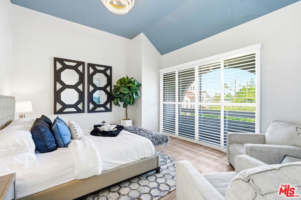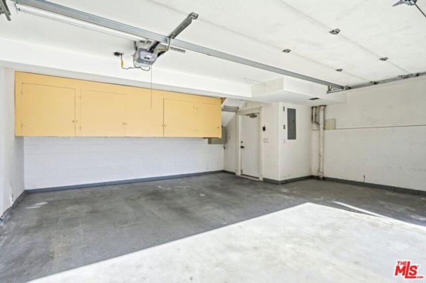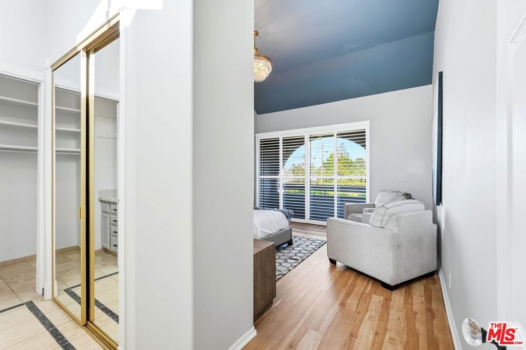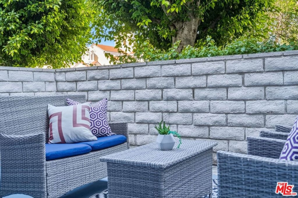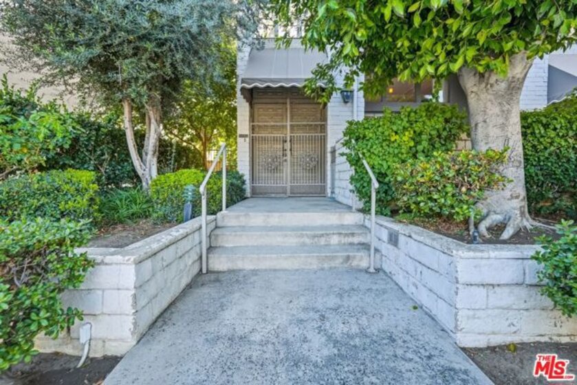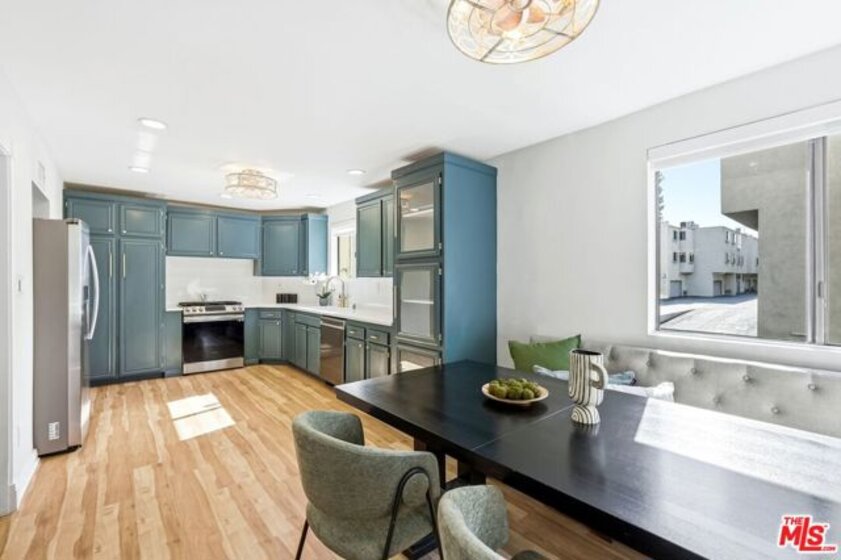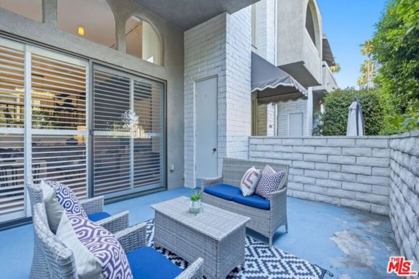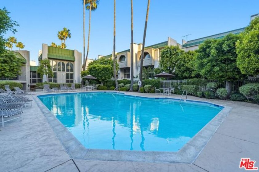 Set within a gated complex with strong architectural character, this townhouse centers on a dramatic main living space with high ceilings and a full wall of windows. A row of arched openings above brings in additional light, softening the scale of the room. The fireplace is finished in textured stone, and the open stair rises alongside it, with dark metal railings that continue through the upper level. The living room opens with ample space for multiple seating areas, centered around the fireplace and the wall of windows. Just above, the dining area sits along the edge of the space, looking down into the room below. Its position keeps it connected to the living room and works well for gatherings and entertaining. A deep blue accent wall and a suspended glass fixture give the area a clear focal point. The kitchen has been updated with painted cabinetry in a muted green, paired with brass hardware and white quartz countertops. Glass-front upper cabinets and a tall pantry wall add storage. The deep sink is set beneath a sunny window, and the layout opens to a dedicated breakfast area with a built-in bench, a natural place to sit and gather. Upstairs, the primary bedroom features a vaulted ceiling and a wide span of windows with interior shutters that bring in consistent light. The primary bath is en suite and features a long double vanity, a walk-in shower, and a separate water closet. The additional bedrooms are well-sized and bright, each with its own outlook and enough wall space to adapt over time, whether used as bedrooms, a guest room, or a workspace. Did I mention there is a secret door as well? A private patio sits just off the living room, enclosed and partially covered by an awning. It lends itself easily to outdoor dining, morning coffee, or a quiet place to sit in the evening. On the lower level, the attached garage provides direct access into the home and includes built-in storage along the back wall. The home has smart technology to control lights, HVAC, and the garage, even when you're not there. The community grounds are mature and well-maintained, with an Olympic-size pool, spa, gym, sauna, and recreation room. It's one of the many reasons why Encino Spa East is considered a desirable complex in the neighborhood. Walkable to Ventura Blvd and all its great shops and restaurants, you might stay here forever, as many residents have lived here for decades.