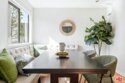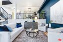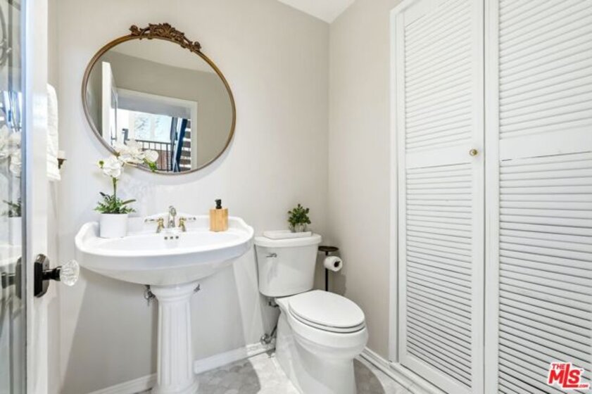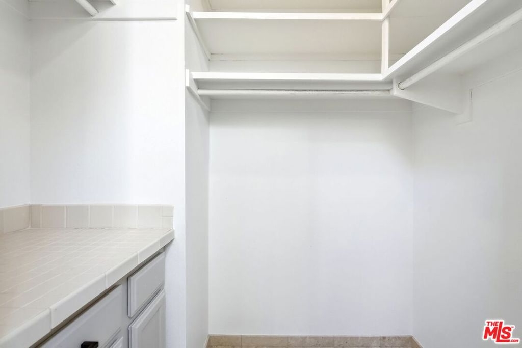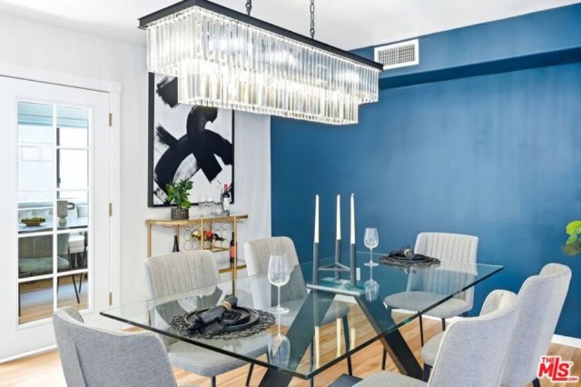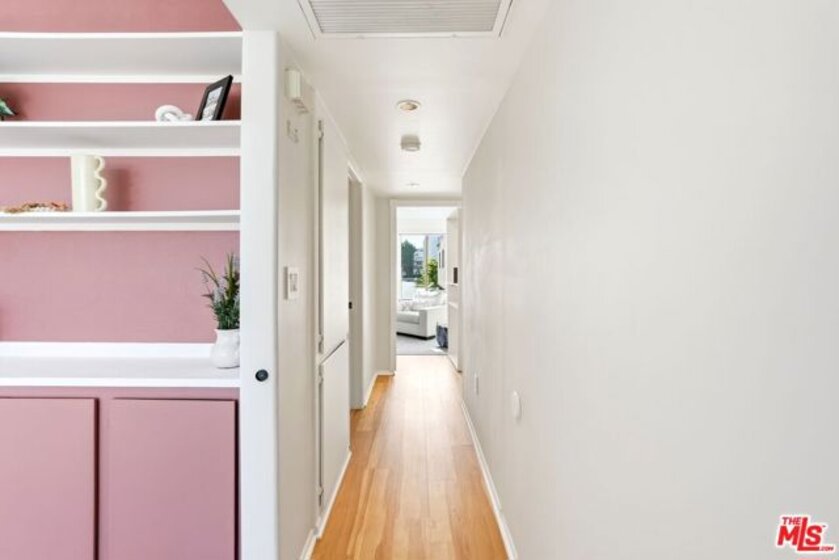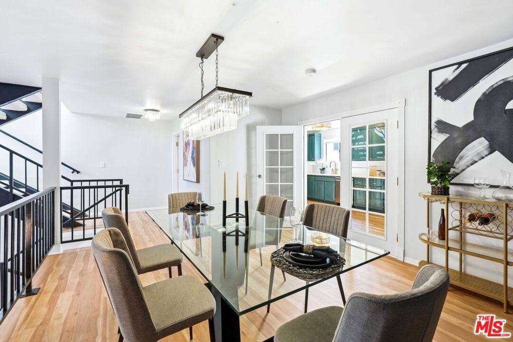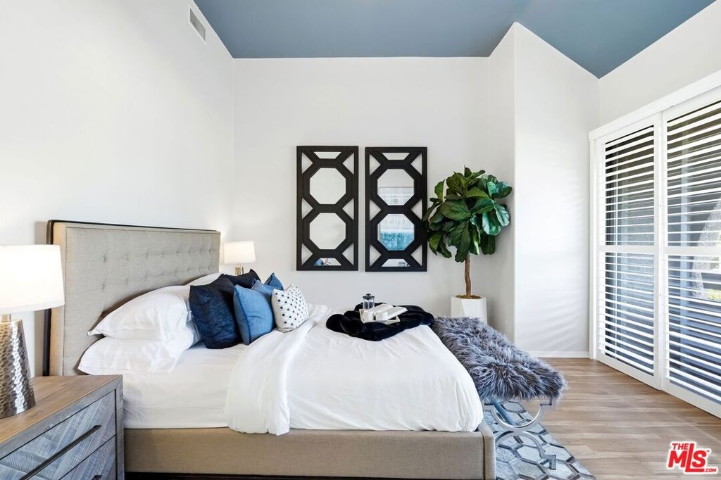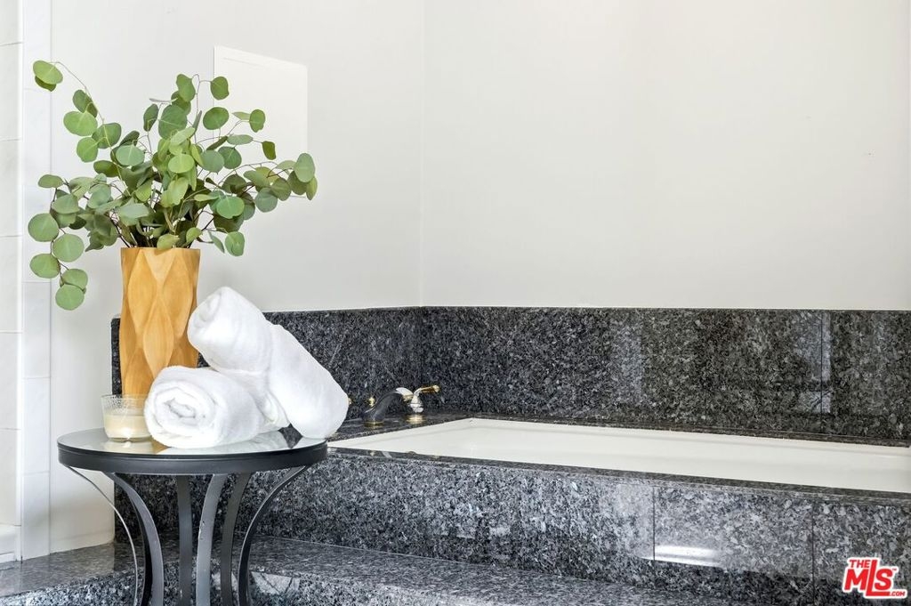 Set within a gated complex with strong architectural character, this townhouse centers on a dramatic main living space with high ceilings and a full wall of windows. A row of arched openings above brings in additional light, softening the scale of the room. The fireplace is finished in textured stone, and the open stair rises alongside it, with dark metal railings that continue through the upper level. The living room opens with ample space for multiple seating areas, centered around the fireplace and the wall of windows. Just above, the dining area sits along the edge of the space, looking down into the room below. Its position keeps it connected to the living room and works well for gatherings and entertaining. A deep blue accent wall and a suspended glass fixture give the area a clear focal point. The kitchen has been updated with painted cabinetry in a muted green, paired with brass hardware and white quartz countertops. Glass-front upper cabinets and a tall pantry wall add storage. The deep sink is set beneath a sunny window, and the layout opens to a dedicated breakfast area with a built-in bench, a natural place to sit and gather. Upstairs, the primary bedroom features a vaulted ceiling and a wide span of windows with interior shutters that bring in consistent light. The primary bath is en suite and features a long double vanity, a walk-in shower, and a separate water closet. The additional bedrooms are well-sized and bright, each with its own outlook and enough wall space to adapt over time, whether used as bedrooms, a guest room, or a workspace. Did I mention there is a secret door as well? A private patio sits just off the living room, enclosed and partially covered by an awning. It lends itself easily to outdoor dining, morning coffee, or a quiet place to sit in the evening. On the lower level, the attached garage provides direct access into the home and includes built-in storage along the back wall. The home has smart technology to control lights, HVAC, and the garage, even when you're not there. The community grounds are mature and well-maintained, with an Olympic-size pool, spa, gym, sauna, and recreation room. It's one of the many reasons why Encino Spa East is considered a desirable complex in the neighborhood. Walkable to Ventura Blvd and all its great shops and restaurants, you might stay here forever, as many residents have lived here for decades.