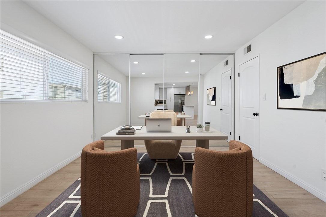 Beautifully Upgraded 2+2 End Unit Condo with Bonus Room in Prime Encino Location! Welcome to this light-filled and stylishly remodeled end-unit condo located in the desirable Encino Terrace community. This spacious 2-bedroom, 2-bathroom home also includes a versatile bonus room—perfect for a home office, den, or easily convertible into a third bedroom, complete with a wall-to-wall custom built-in closet. The open-concept layout features a chef-inspired kitchen with a large island, quartz countertops, stylish cabinetry, double sinks, stainless steel appliances, and a sleek range hood. The kitchen flows seamlessly into the dining and living areas, creating a perfect space for entertaining. Natural light floods the unit, highlighting the brand-new flooring and recessed lighting throughout. The primary suite is spacious and bright, with a beautifully upgraded en-suite bathroom offering double sinks, a walk-in shower, and a custom walk-in closet. The secondary bedroom includes a built-in desk and its own custom closet, with a full bathroom conveniently located nearby. Additional highlights include dual-pane windows, updated finishes throughout, and two covered tandem parking spots with storage, located close to the unit. Enjoy the resort-style amenities of Encino Terrace, including two pools, a spa, gated entry, and two community laundry rooms—one just steps away from your door. Ideally located just off Ventura Blvd, you’re minutes from top restaurants, shopping, and easy freeway access. This turnkey unit combines comfort, function, and location—don’t miss this incredible opportunity to own in the heart of Encino!
