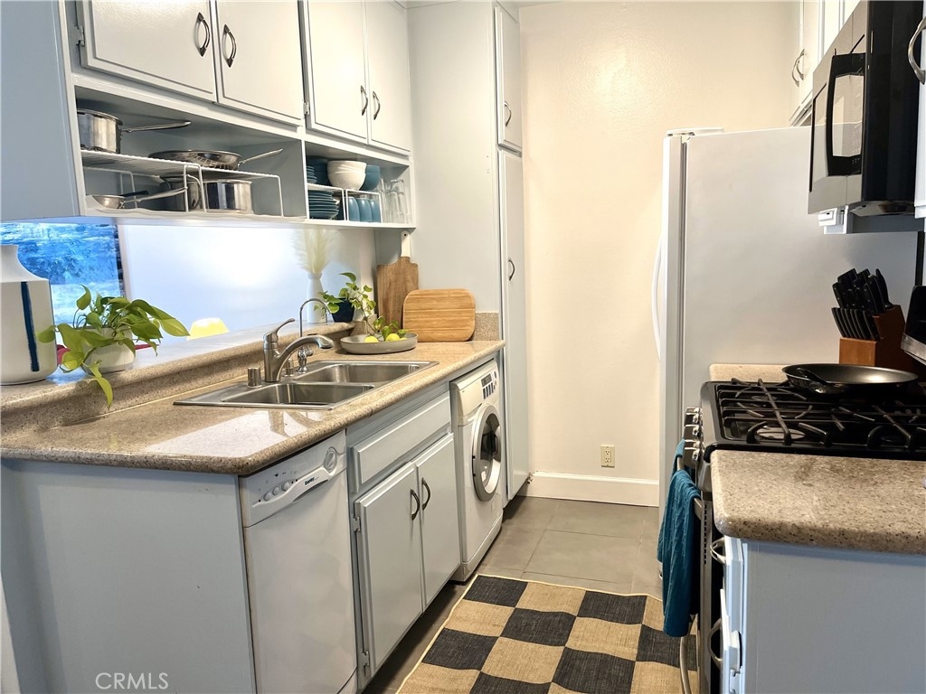 Delightful two large bedrooms and 2 baths. Delightful built-ins throughout. Just one block north of Ventura Blvd. where great shopping and eateries abound. Spacious rooms, large master. Living room has a fireplace, high vaulted ceilings and through the sliding glass door, spectacular sunset views. Large bedrooms are separated by walk in closet. Security gate for this and 3 other units only in this quad at the building. Subterranean parking for 2 cars close to the unit. In-kitchen laundry unit with combo washer/dryer, but also has laundry facilities in the complex. This unit will not last. May require a 15-20% down payment. Contact listing broker for more information. Unit would make a great rental unit. No rental restrictions.