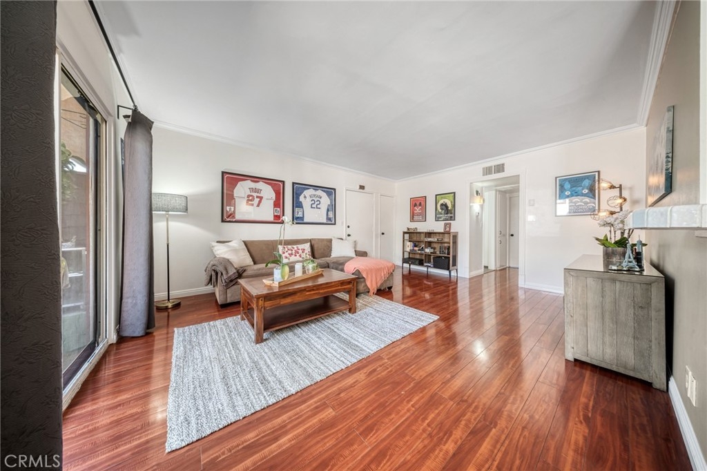 This top-floor unit delivers a bright and spacious living experience right in the heart of Encino. The open-concept living room, filled with natural light, features sliding glass doors that open to a private balcony with serene views of a beautifully maintained courtyard. The freshly painted white kitchen offers generous cabinet space and flows effortlessly into the adjacent dining area. Rich cherry wood floors bring warmth and charm throughout the home. The primary bedroom includes a walk-in closet, while the second bedroom offers double sliding door closets for ample storage. Both bathrooms have been thoughtfully updated with stylish, modern finishes. Additional upgrades include a brand-new HVAC system installed by the current owners. Residents also enjoy a range of community amenities, including a gym, pool, recreation room, two laundry facilities, and BBQ grills by the pool. The HOA covers water, trash, and sewer services for added convenience. The building offers secure entry, and the unit comes with two covered parking spaces in a gated garage. Perfectly situated just off Ventura Boulevard, you’re within walking distance of top-rated restaurants, boutique shops, grocery stores like Trader Joe’s, cozy coffee spots, and fitness centers such as Equinox and LA Fitness. Outdoor lovers will enjoy proximity to Lake Balboa Park and the Sepulveda Basin Recreation Area, which includes golf courses, tennis courts, and scenic trails for biking and jogging. This property also lies within the sought-after school zones for Nestle Avenue Charter Elementary and Gaspar De Portola Middle School, offering access to quality education.