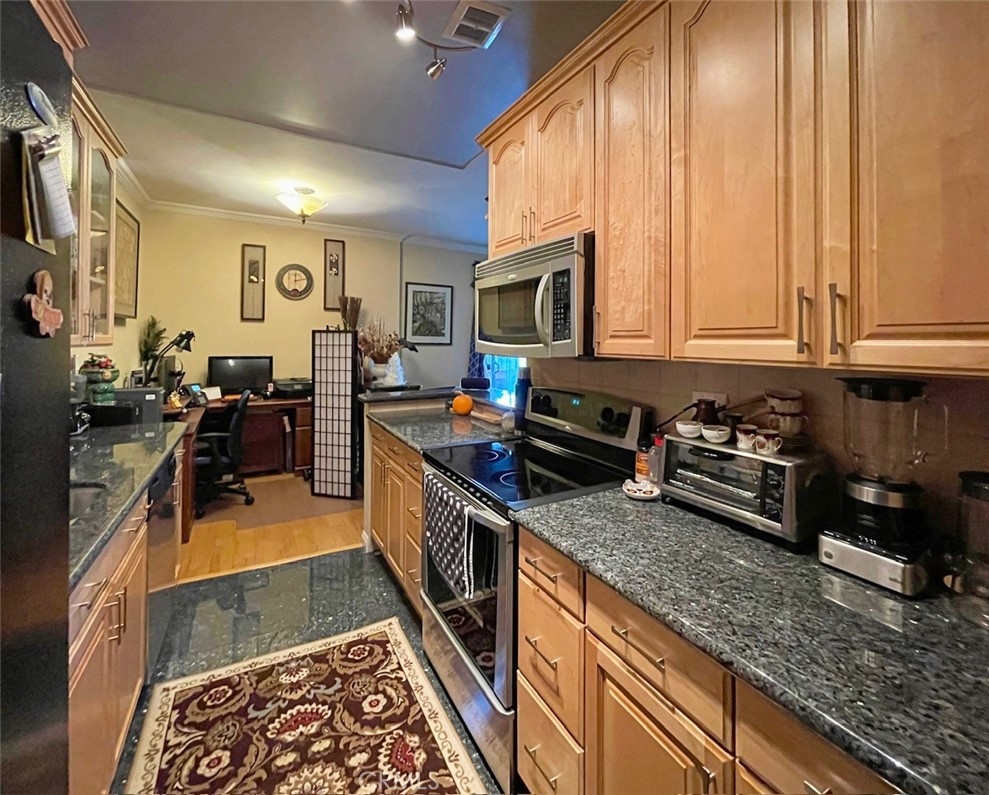 Stunning Encino complex provides resort like living. This fully remodeled 1 bedroom 1 bath condominium is a must see. It’s one of the highly sought after upper level units with no one living above. The large living room is bathed in natural light and has a direct access to the large private patio-balcony overlooking a beautiful view of the greenbelt. The complex offers a swimming pool and spa for hot summer days, The family’s cook is going to appreciate the kitchen’s maple cabinets, granite counter tops and flooring, all the current appliances, and the adjoining dining area. Laminated flooring in living room and bedroom. The bathroom has a jacuzzi hot tub for your comfort. Large storage in the parking area. The community that is pet friendly and offers a fitness center, recreation, pool & spa, bar-be-que area that is surrounded by beautiful courtyards with green pathways & grassy areas prefect to enjoy the outdoors. Waking distance to Ventura Blvd, local shops, restaurants and grocery stores. Easy access to 101 freeway.