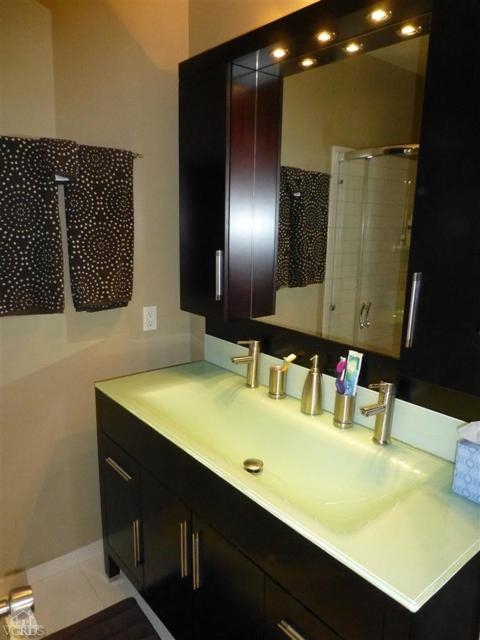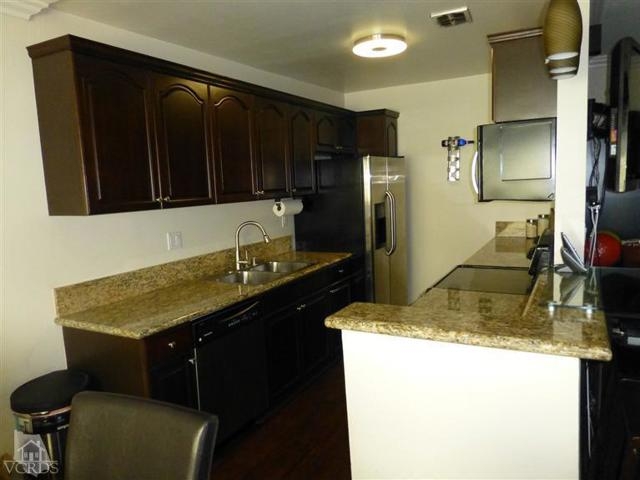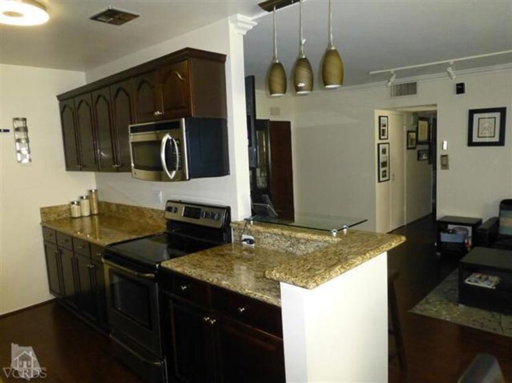 This completely remodeled condo is ready to move in. It features newer dark stained kitchen cabinets, stainless steel appliances, and granite countertops. Newer pergo style floors enhance the elegance of this stylish one-story condo. Both bathrooms have been remodeled with new vanity sinks, faucets, and showers. Designer beveled glass mirrored doors in each bedroom, and walk-in closet in the master bedroom. Dining area has ceiling fan and crown molding. Living room with balcony. Two parking spaces in secured underground parking lot. Secured building comes with community pool and spa, area for BBQ, and common area laundry rooms. The HOA has been enhancing the building so this well maintained condo complex is ideal for your buyer. You won't find a better unit in Encino for this price!