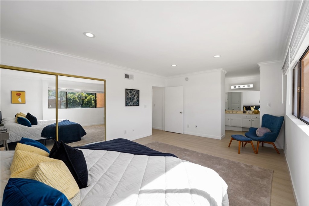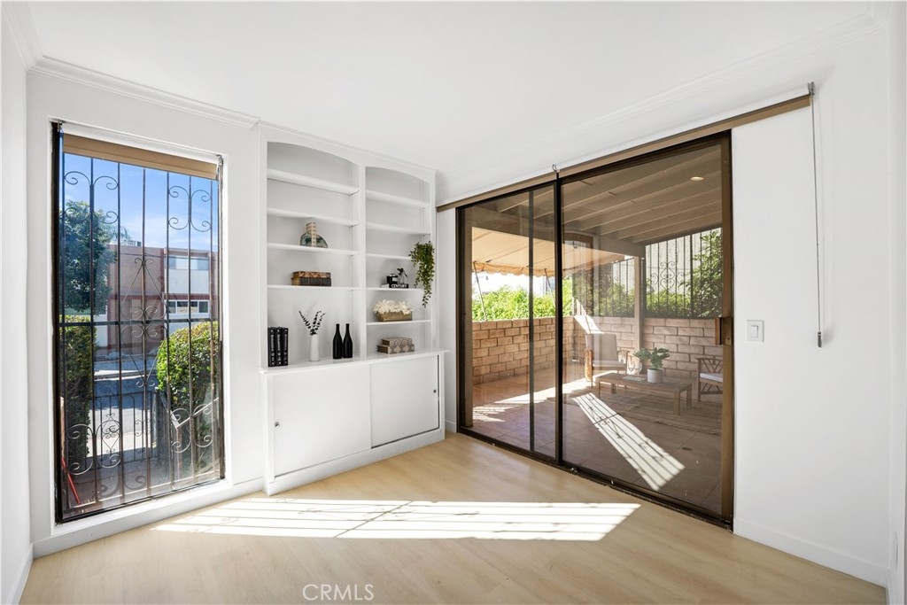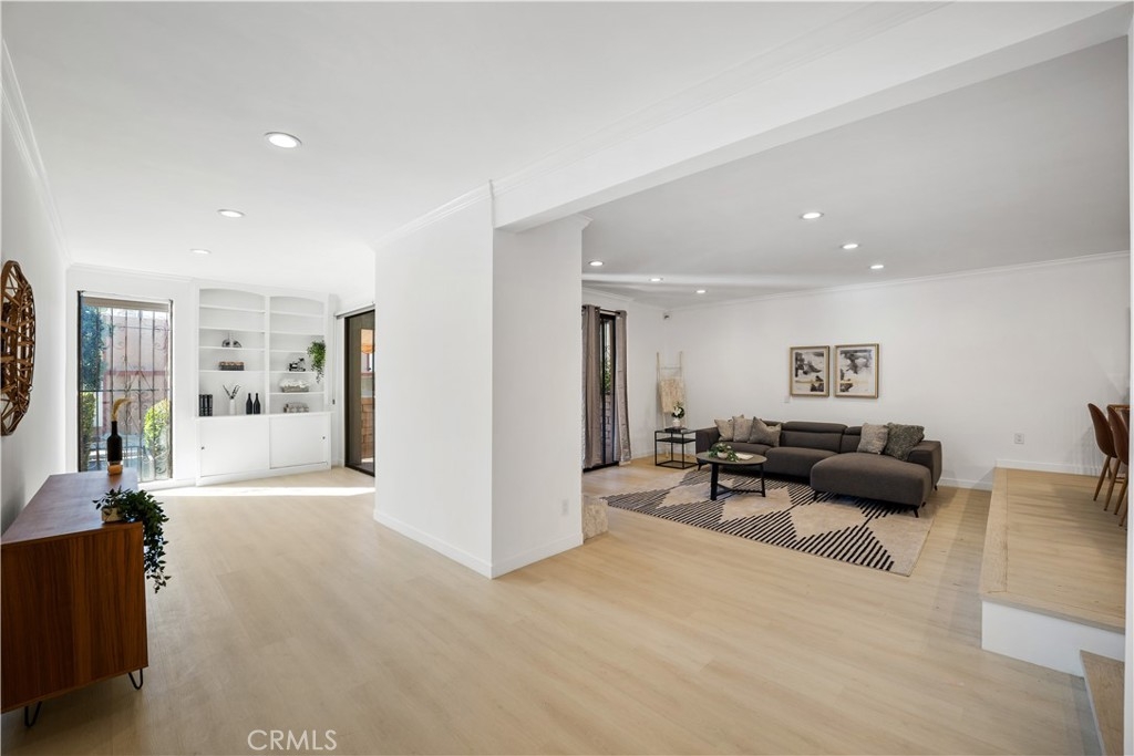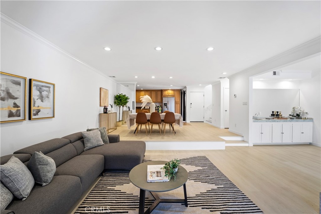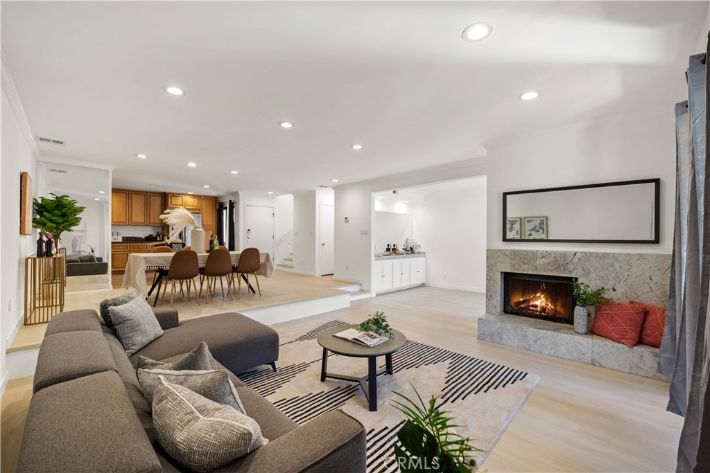 Introducing this charming two-story condominium, featuring an inviting open floor plan with a generous 1,685 sq. ft. of living space. This well-appointed residence features two bedrooms and two and a half bathrooms. Upon entering, you're greeted by an expansive dining area adorned with built-in cabinets. The spacious kitchen showcases sleek stainless steel appliances and seamlessly connects to the living area. Step down into the spacious living room, filled with natural light and featuring a cozy fireplace. A den with a wet bar and a convenient powder room enhance the living space. Step outside to the patio, perfect for al fresco relaxation. Upstairs, you'll discover two bedrooms, including the master bedroom, complete with a dual sink and a stunning stained glass window. Additionally, the upper level offers the convenience of a laundry room with side-by-side washer and dryer. This meticulously maintained complex is ideally situated in close proximity to Ventura Blvd., offering easy access to the freeway, local parks, and an array of exceptional shops and restaurants. Residents of this building can also enjoy the added amenities of a pool, spa, and recreation room. The unit provides gated side-by-side garage parking for two cars.