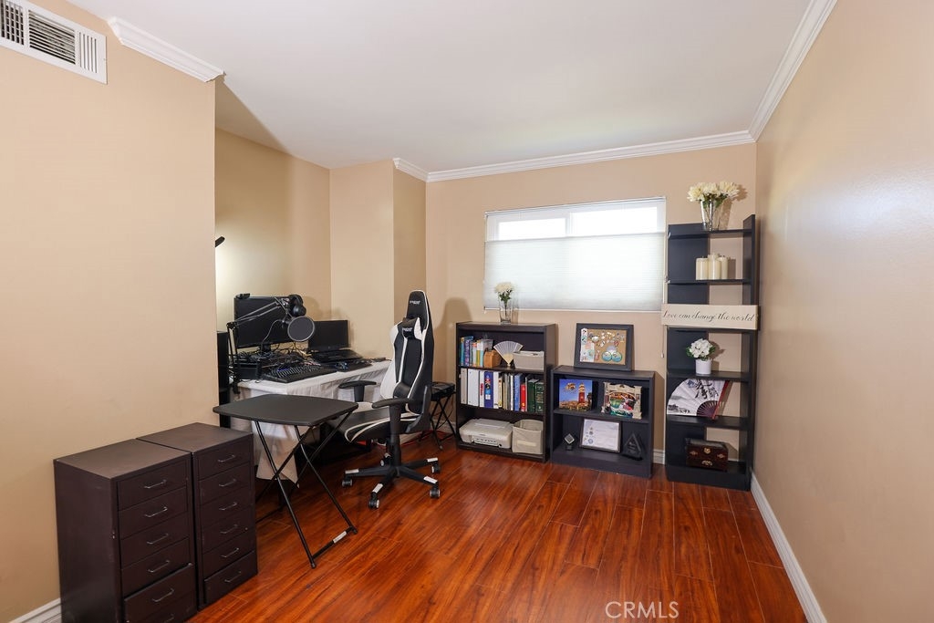 Spacious two bedroom condo with en-suite, an additional den/office that can be converted to a third bedroom. Unit opens into an outside hallway no front door neighbors. One of the few in complexes with private balconies and mountain views. Floor throughout the unit. Community pool, spa, sauna & BBQ area. Security building, 2 tandem parking spaces and storage area. HOA pays trash & water.