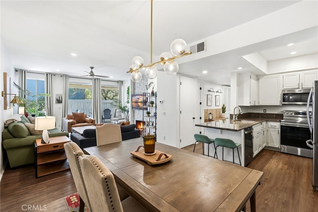 If you are a buyer looking to be close to restaurants and shopping near Ventura Boulevard, and you have been searching for a turnkey lower-level 2-bedroom condo with amazing resort-like grounds, covered side-by-side 2-car parking, and extra storage for your recreational items, then you have just found White Oak Encino Condos. You will be impressed from the moment you enter this gated community, featuring flowering planters and inviting walkways. Enjoy a splash in the resort-inspired pool, relax in the indoor spa, and take in the ambiance of the spectacular clubhouse. Reasonable HOA dues cover fire insurance, earthquake insurance, water, gas, trash, sewer, and landscaping, which is a rare and valuable benefit these days. Almost forgot to mention the 20+ off-street guest parking spaces available for your visitors—they are sure to love that feature. Now let’s step inside the unit. The front door opens to a formal entry hallway leading to a spacious living room with a wall of sliding glass doors that fill the space with natural light. The fireplace is perfectly positioned for cozy Netflix nights while enjoying the warm glow of the fire. Your private enclosed covered patio is the perfect place to enjoy a home-cooked meal al fresco. The galley kitchen offers wood cabinetry, granite countertops, a double sink, and stainless steel appliances, while the adjacent dining area is ready to host your next meal. Down the hallway, you will find the guest bedroom, which can also serve as an office, featuring patio slider access, wall closet storage, and a beautifully designed bathroom that adds charm and character to the space. The washer and dryer are also conveniently located in the hallway. The primary bedroom is sure to impress, offering natural light, abundant closet space, and a spa-like bathroom complete with a soaking tub, walk-in shower with dual shower heads, and a double vanity—so there will be no fighting for space. This Encino condo lifestyle is one you will truly love.