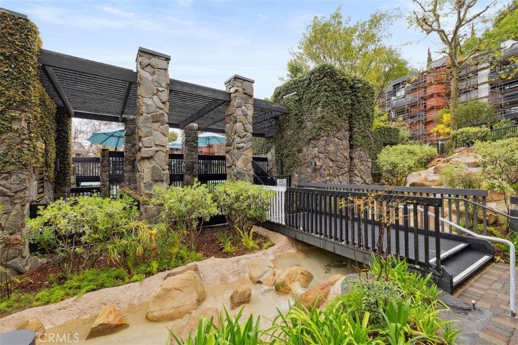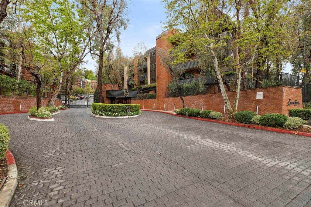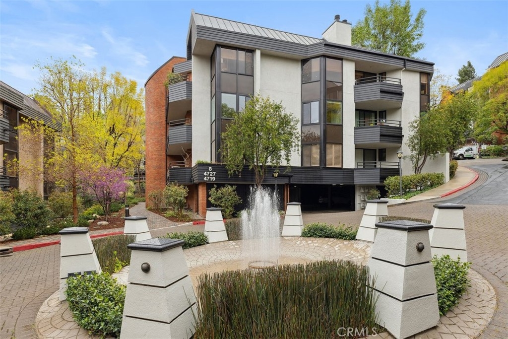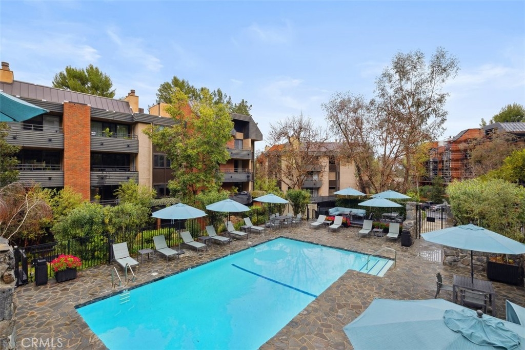 Discover this rarely available first-floor, single-level condominium with 2 bedrooms and 2.5 bathrooms with almost 2,300 square feet. The grand living room is bathed in natural light, courtesy of large windows that provide picturesque views and a bright, inviting atmosphere. Adjacent to the living area, you'll find a den that offers a versatile space that can be used as a home office, library, or additional guest area. The spacious primary suite is a true retreat, with an oversized walk-in closet, a cozy fireplace, and direct access to a delightful private balcony. The primary bath is complete with a double vanity, soaking tub, and separate shower. The well-appointed secondary bedroom has an en-suite bath and also grants access to the balcony, making it an ideal guest room. The formal dining room is perfect for large family gatherings or special occasions. Marble entryways and beautiful shutters in most rooms accentuate the elegance of this residence. Step outside to enjoy the lushly landscaped grounds, featuring running fountains, c reeks and waterfalls. As part of a vibrant community, you will enjoy exceptional amenities including a sparkling pool, rejuvenating spa, recreation room and both pickleball and tennis courts. Enjoy approximately 900 square feet of additional open-air living space on the open outdoor patio. 24-hour front gate security and on-site office for your convenience. Located just minutes from fabulous shops and dining, and with easy access to Beverly Hills, Downtown LA, and the beaches. Don't miss your chance to own this exceptional condominium that seamlessly blends luxury, comfort and security in one of Encino's most sought-after locations.