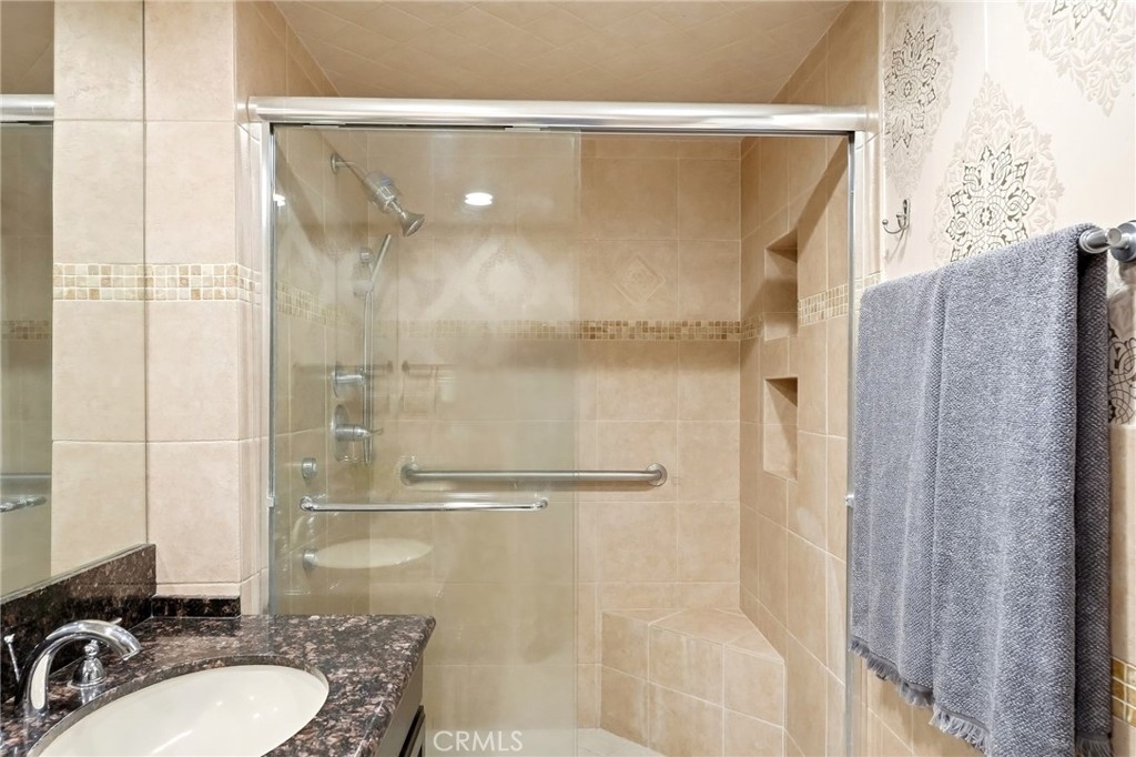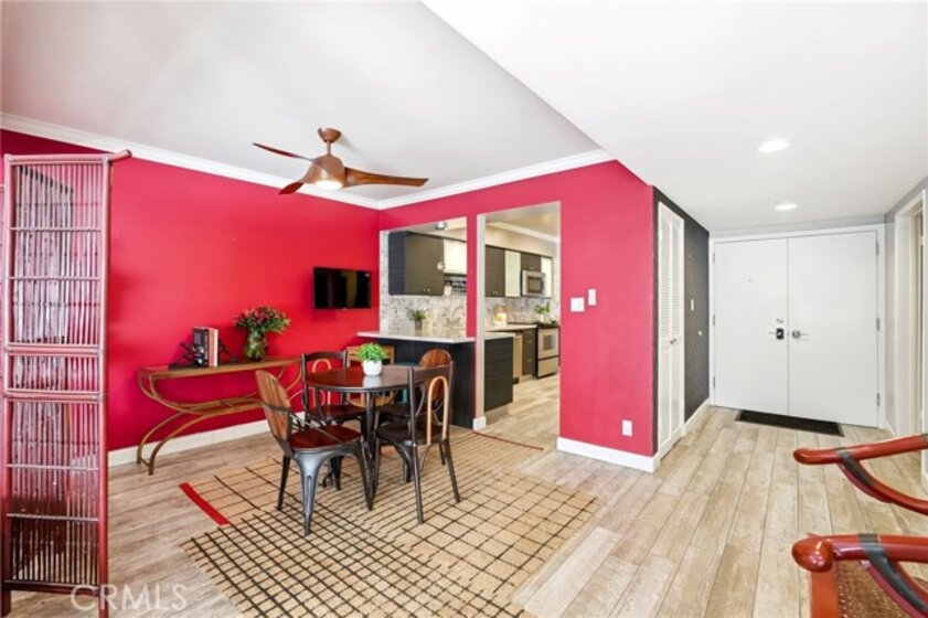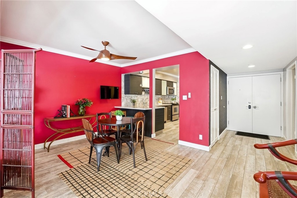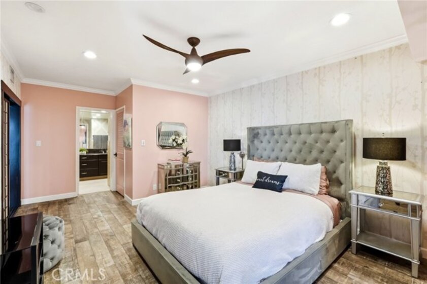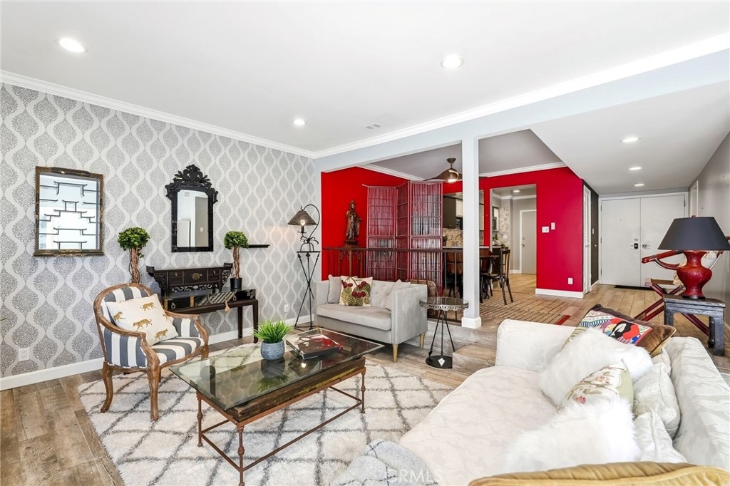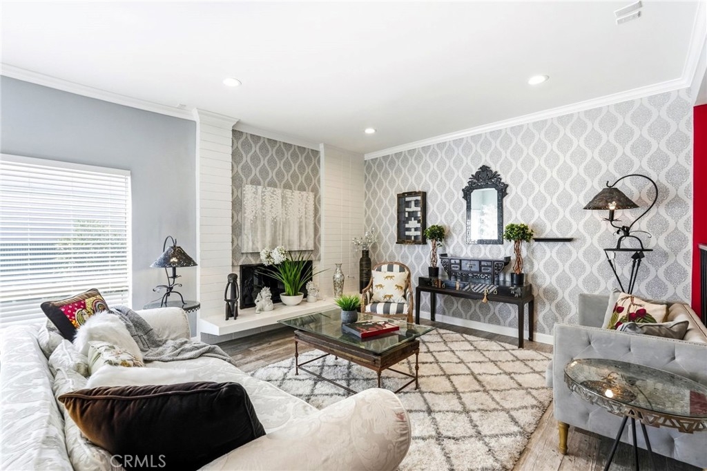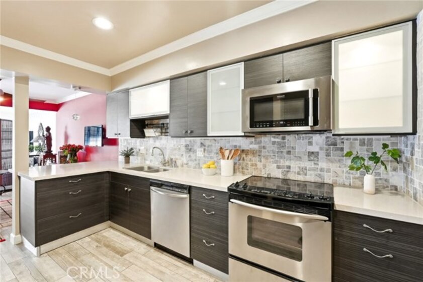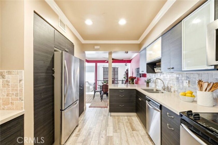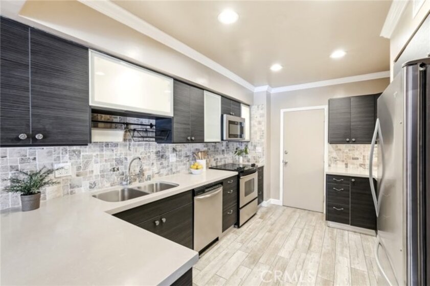 Ideally located in one of Encino’s most desirable pockets, in close proximity to Ventura Boulevard, this top floor condominium offers an ideal blend of comfort, style, and convenience. Spanning approximately 1,266 square feet, the residence features two spacious bedrooms and two bathrooms with a layout that feels both functional and inviting. Inspired by a sophisticated city-chic aesthetic, the home is filled with character and thoughtful design. The spacious living room serves as the centerpiece of the home with its inviting fireplace, elegant finishes, and seamless connection to the dining area, creating a warm and welcoming atmosphere for both everyday living and entertaining. The kitchen offers generous storage, extensive counter space, stainless steel appliances, and a breakfast bar, opening to the main living areas. Crown molding, recessed lighting, updated flooring, and custom details throughout add to the home’s polished feel. The en-suite primary bedroom offers a peaceful retreat with a walk-in closet and a private bathroom featuring dual sinks and an updated shower. The second bedroom is generously sized and conveniently located near the additional full bath, which features a walk-in Jacuzzi tub for added comfort and accessibility. One of the standout features of the home is the enclosed outdoor patio area with a built-in barbecue, offering the perfect extension of the living space and a unique setting for relaxing or entertaining year-round. Additional highlights include central air and heat, two side-by-side parking spaces, extra storage, secured entry, and the privacy of having no neighbors above. Residents also enjoy an upscale lobby, community laundry, and a prime location close to Ventura Boulevard’s dining, shopping, entertainment, parks, golf courses, and easy freeway access. Offering style, privacy, and an unbeatable Encino location, this top floor residence is a rare opportunity to enjoy elevated condo living in the heart of the city.