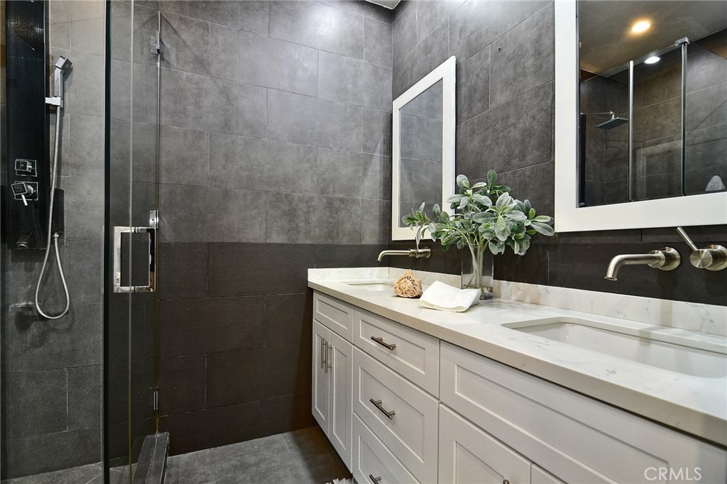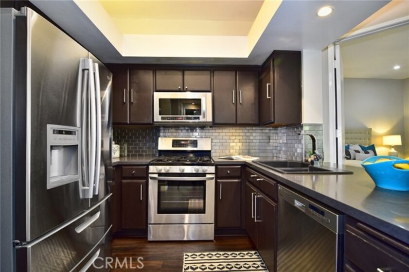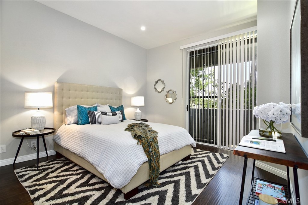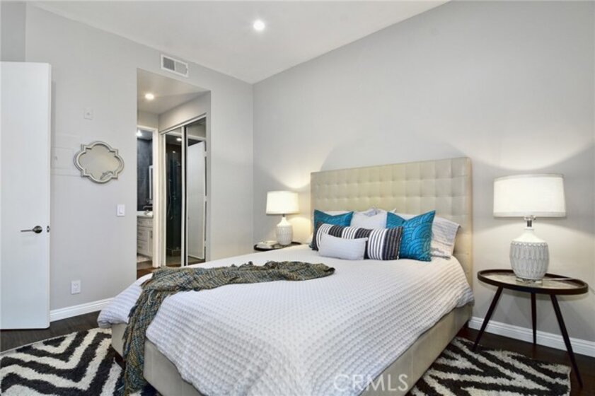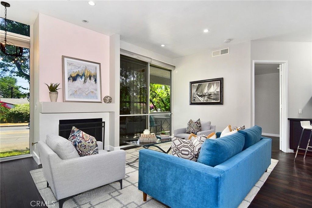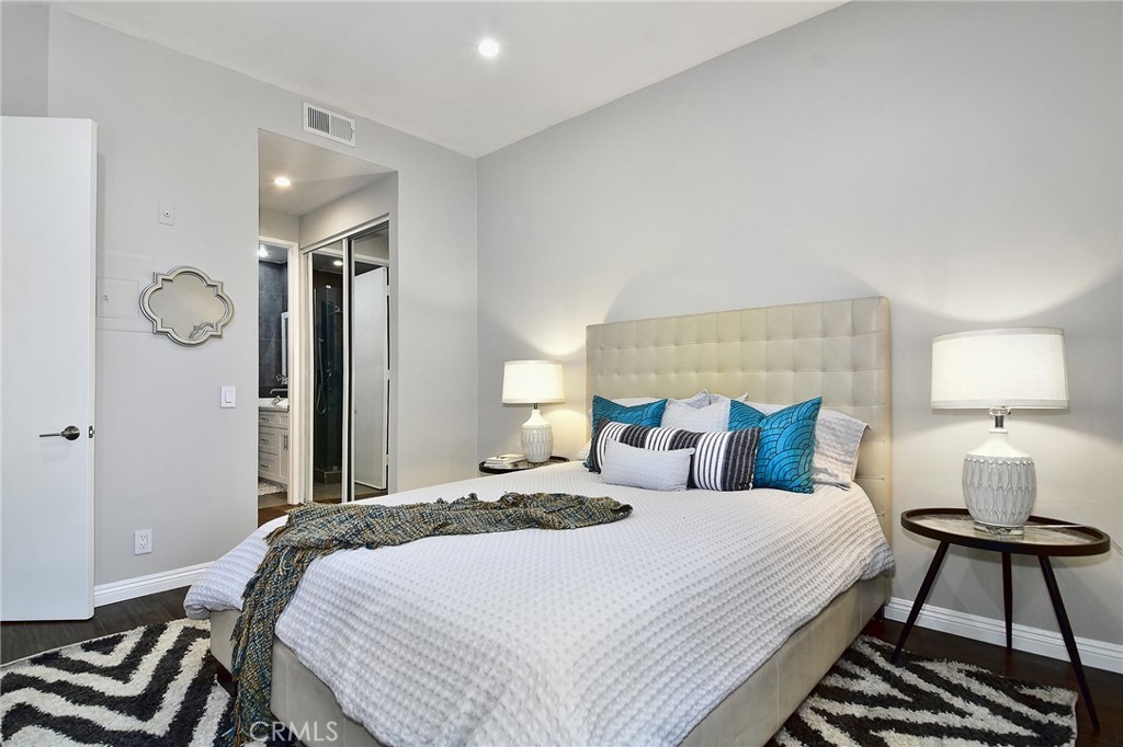 Tastefully updated single story 2 Bed + 2 Bath CORNER UNIT Condo w/Laundry! A charming complex adjacent to the multi-million dollar homes of Amestoy Estates & 1 block from Ventura Blvd! From the moment you enter, you immediately appreciate the 11 ft+ tall ceilings throughout the entire unit. Dramatic kitchen with CAESARSTONE QUARTZ counter tops, stainless steel appliances and stainless steel backsplash provide open views to the living room. Gleaming wood laminate floors throughout an open concept floor plan offering two master suites w/attached baths on opposite sides of the unit. Recessed lighting, relaxing gas fireplace and a conveniently located patio off the living room, perfect for a BBQ and restful sitting area. Showstopper master bathroom wrapped in wall to wall tile offering double vanity sinks w/luxurious wall mounted faucets & a custom glass shower enclosure w/a spa like jet shower! In addition, this property features a programmable NEST thermostat, RING doorbell, LAUNDRY inside and 2 SIDE BY SIDE parking spaces in the garage. A small and private community featuring only 28 units & extremely LOW HOA. Amenities include a spa, barbecue area, gym, sauna and recreation room. This condo is close to all of Encino's finest shops and restaurants and is located in top rated ENCINO CHARTER ELEMENTARY, so hurry!
