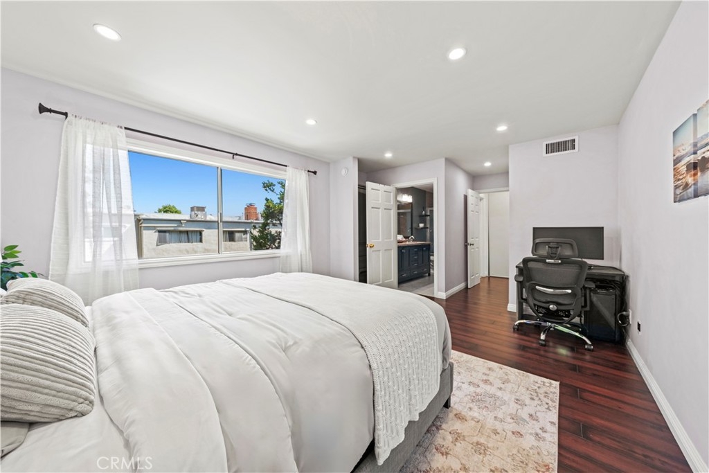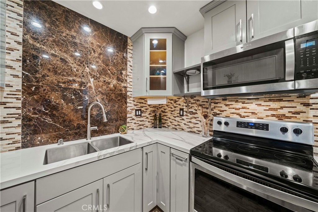Welcome to this stunning, remodeled end-unit that boasts a split-wing floor plan with 2 primary suites, 2 updated en-suite bathrooms, dedicated parking, garage storage, and an IN-UNIT WASHER/DRYER! Enter through the double-door entry into this immaculate unit with a large living room that's designed for entertaining complete with recessed lights and a CEILING PROJECTOR and BUILT-IN SURROUND SOUND SYSTEM providing a true movie-like experience. Your custom-designed kitchen features stunning porcelain countertops, mosaic tile backsplash, modern shaker style soft-close cabinetry with two Lazy Susans and a pull-out spice rack, stainless steel appliances, recessed lighting, and Italian-tiled flooring. Natural light pours in through the large windows of both bedrooms which offer privacy being set on opposite ends. One side features a walk-in closet, office desk area, and a bathroom that screams modern elegance boasting a double-sink vanity with granite countertops, floating shelves, and a drop-in bathtub adorned with beautiful tiled walls and floors. The other suite includes a wall-mounted TV, a bathroom featuring an updated vanity with granite countertops, and a walk-in shower with a bench seat, frameless sliding shower doors, and beautiful tiled walls. Your private living room balcony offers peace and tranquility behind beautiful trees while you get to enjoy your morning coffee or calm evenings while listening to birdsong and nature. Your controlled-access building features a formal lobby, secured parking garage with dedicated parking, elevator, common area laundry, and an HOA includes a pool, BBQ area, water, gas, and trash. Located close to multiple parks, eateries, shops, and entertainment options within the Encino Commons and Ventura Blvd with easy access to major freeways (101, 405, Metro Busway) what more could you ask for! Don’t miss this exceptional opportunity to own a move-in ready condo with all the modern conveniences and a prime location!