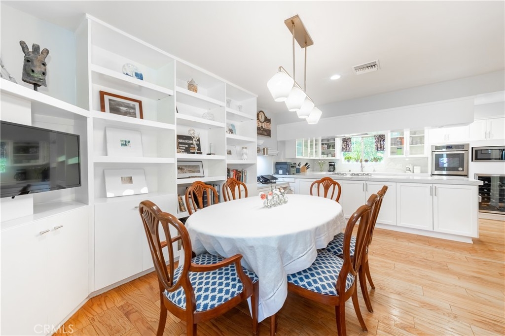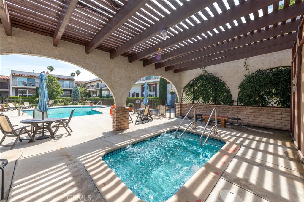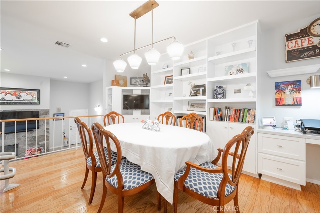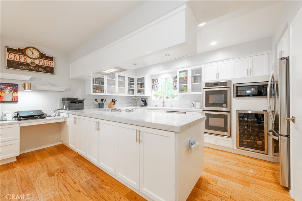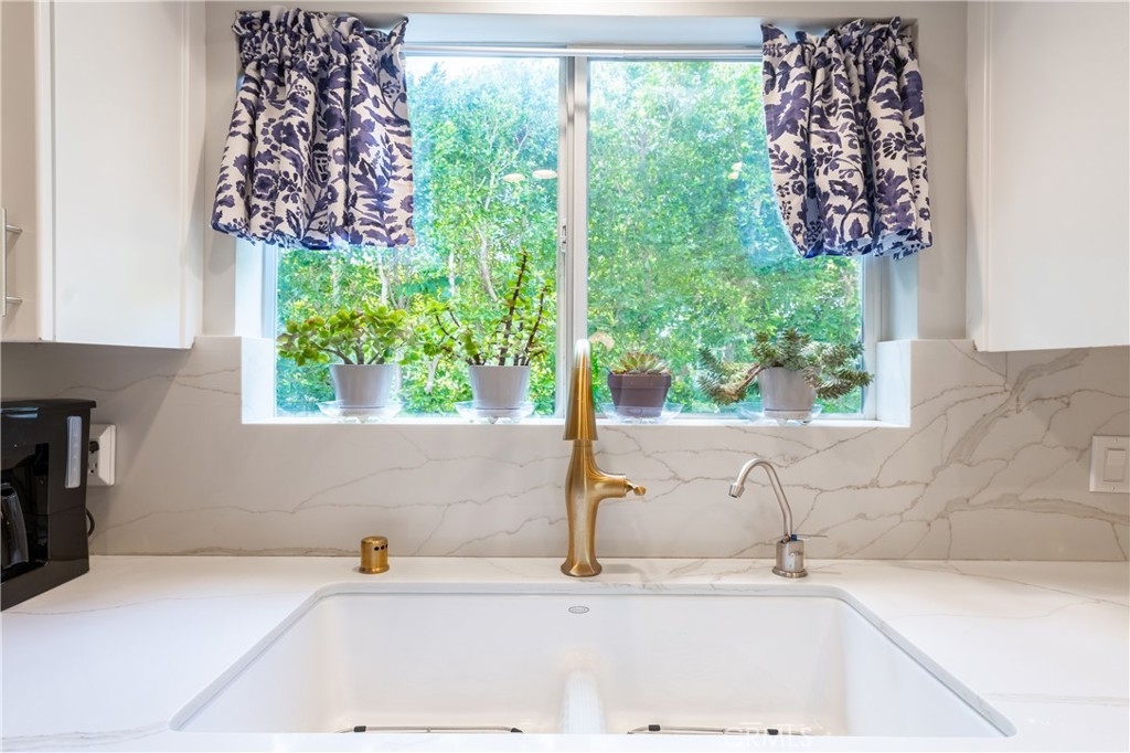 Step into this beautifully updated townhome located in a prestigious gated complex in prime Encino. Upon entry, marble flooring leads into a stylish living room featuring a marble-encased fireplace, soaring two-story ceilings, designer carpeting, and sliding doors that open to the serene patio with privacy hedges and wood-like flooring perfect for relaxing or entertaining. Just a few steps up, the elevated dining room with wood floors overlooks the living space and boasts built-in shelving, extra storage, and a convenient desk area. There is a built-in hutch in the breakfast area that leads to the gourmet kitchen, a true showstopper that features quartz countertops and backsplash, soft-close cabinetry with glass-front accents, pull-out drawers, and high-end stainless-steel appliances including a wine refrigerator along with a walk-in pantry, and ceiling fan adding both function and style. A chic powder room completes this level. Upstairs, the primary suite is a luxurious retreat, that has been expanded by a sitting room. This light-filled space includes walls of glass, sliding doors to an egress with lush views, dual closets, and an upgraded en-suite bath with quartz counters, dual sinks, a vanity area, and a large soaking tub with multiple faucets. The additional two spacious bedrooms share a beautifully updated ¾ bath with a rain shower and multiple faucets. Ceiling fans are featured in all bedrooms for added comfort. Additional amenities include recessed lighting, a 2 car direct access garage with washer, dryer, and even more storage. Enjoy resort-style amenities, including a community pool, spa, BBQ area, and recreation room. Ideally located near shopping, dining, and top-rated schools, this exceptional townhome is a rare find just blocks from Ventura Boulevard and all the fine dining and shops in this much-desired neighborhood and within the highly sought-after Encino Charter Elementary School District.