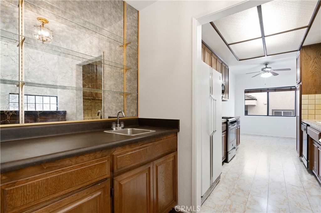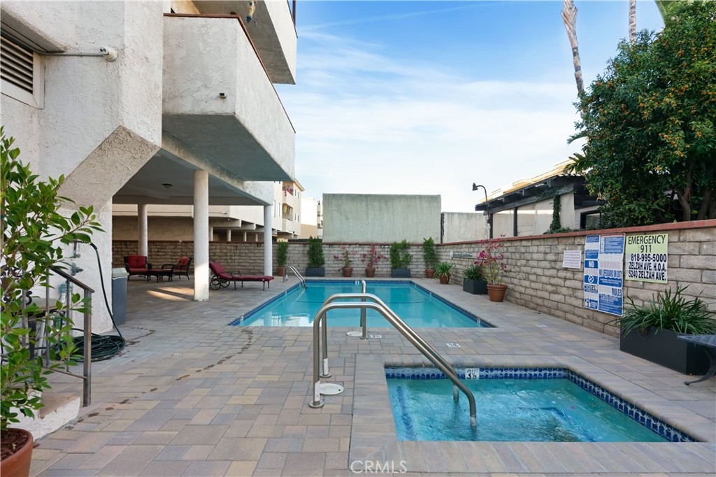 This rare front-facing corner condo in a highly desirable Encino location features a thoughtfully designed 2,044 sq. ft. floor plan, offering both spaciousness and functionality. Enter through double doors into a bright, light-filled home with soaring 9-foot ceilings. Sharing only one wall, this private unit features two generously sized bedrooms with en-suite bathrooms and ample closet space. The primary suite includes a walk-in closet and a spa-like bathroom with dual vanities, a soaking tub, and a separate shower. The second bedroom includes a private full bathroom and a large closet, making it well-suited for guests or family. This residence offers the ease and accessibility of single-level living with no interior steps. Highlights of this home include a powder room, in-unit laundry, and a well-appointed kitchen adjacent to a dining area and wet bar. The spacious living room, with its custom fireplace, flows seamlessly into an adjoining den that opens to a private north-facing balcony, ideal for relaxation or entertaining. The secure complex enhances the lifestyle with amenities such as a pool, spa, sauna, and recreation room. Two side-by-side parking spaces, a private storage area, and ample guest parking provide added convenience. With only 14 units, this intimate building fosters a welcoming and peaceful atmosphere. Situated just steps from Ventura Boulevard, this prime location places you near shopping, dining, Trader Joe's, and Gelson's, offering the best of Encino living. This property combines space, accessibility, and the opportunity to personalize. This home is not to be missed!