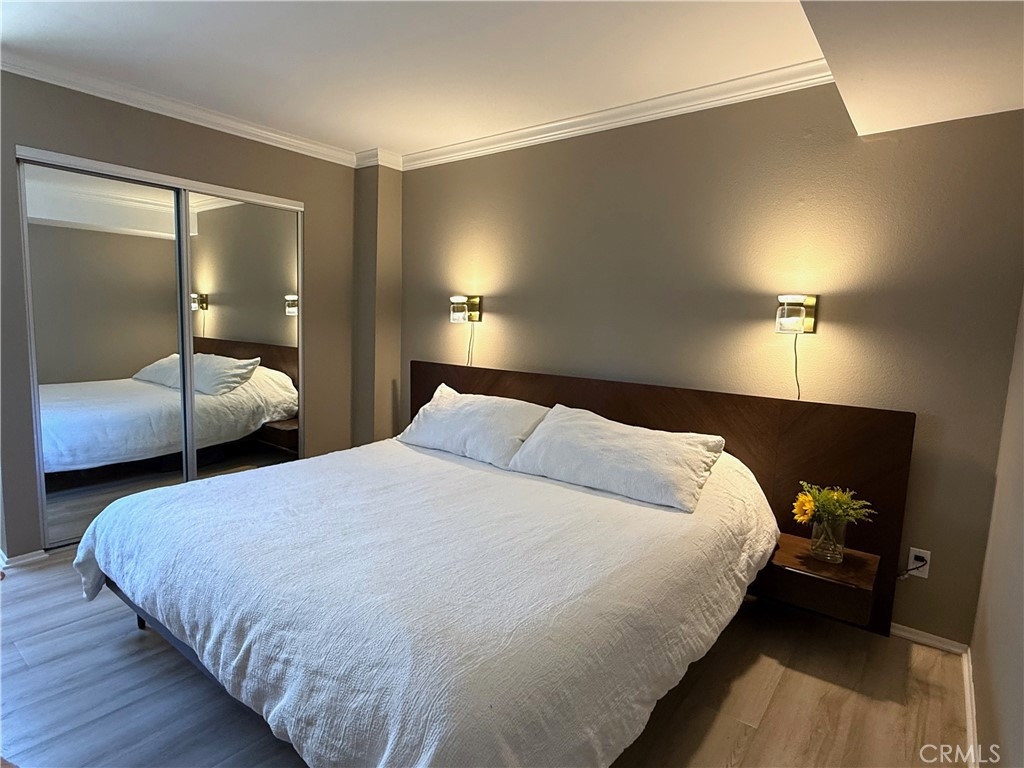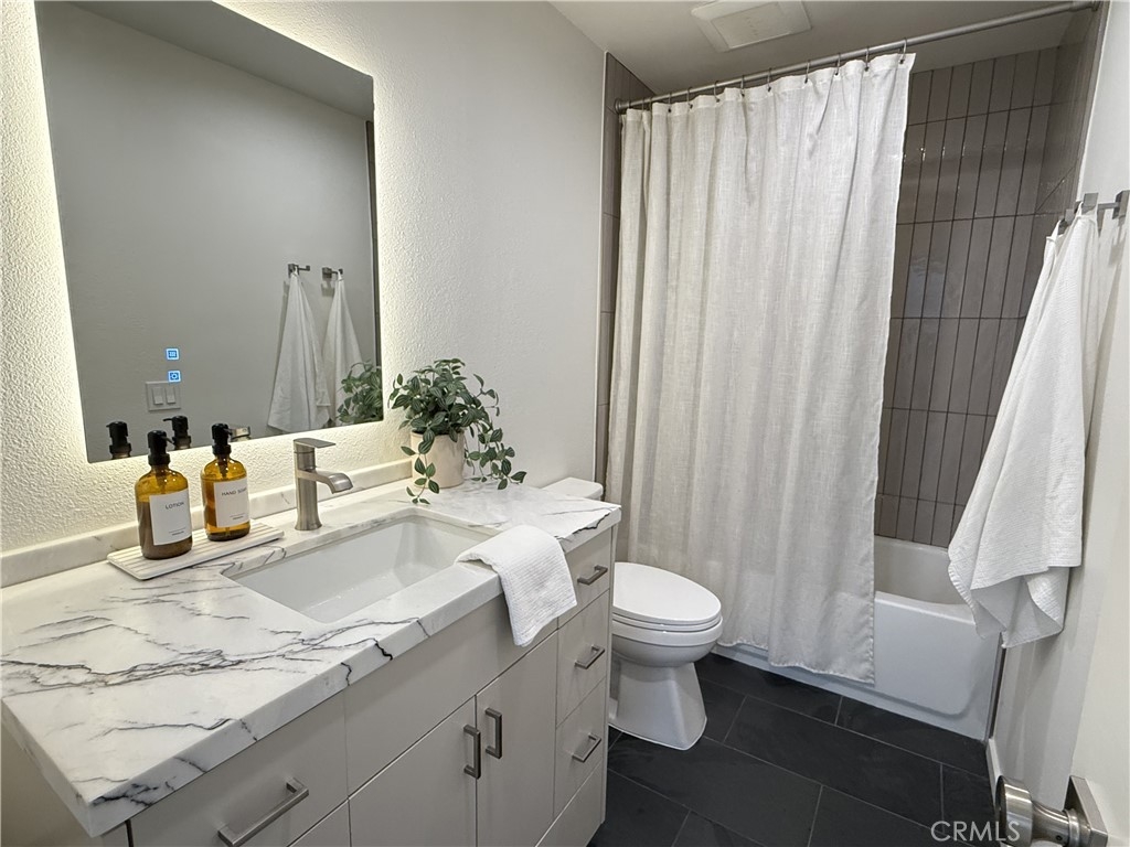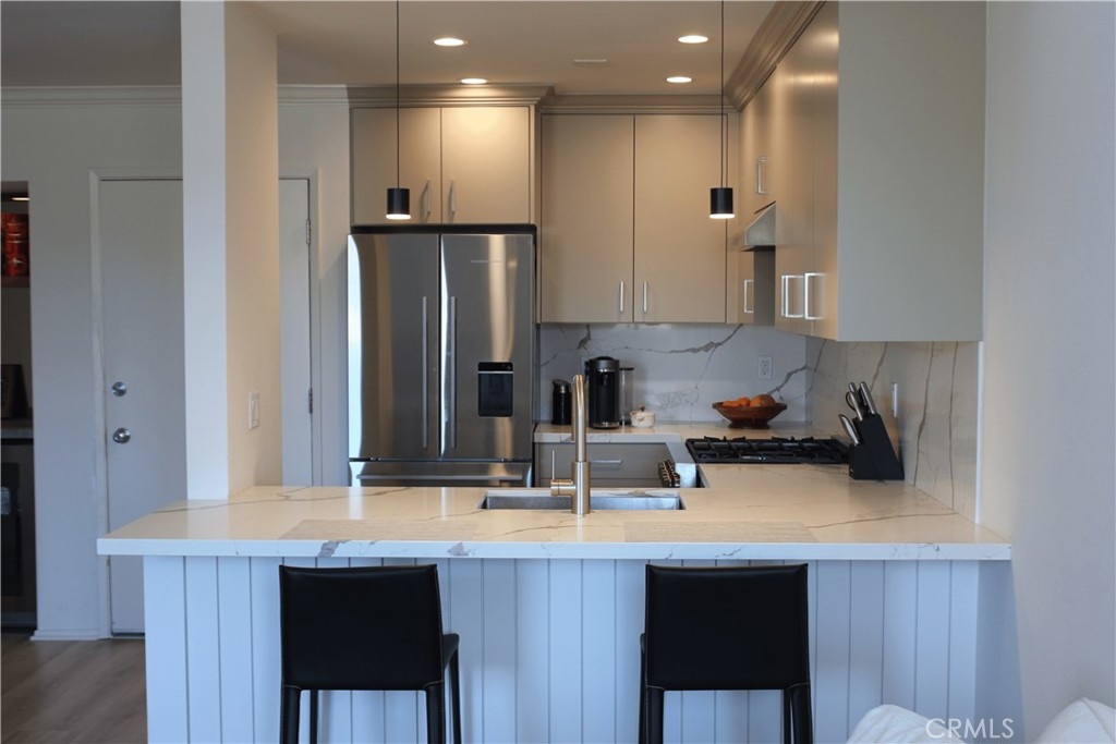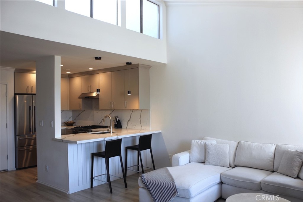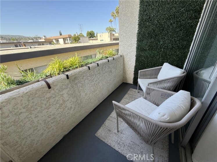 The Park Encino Condos, Unit #321 — a rare top-floor corner unit with no neighbors above and only one shared wall, offering privacy and tranquility in one of Encino’s most desirable communities. This tastefully renovated 2-bedroom, 1-bathroom condo features vaulted ceilings and abundant natural light. The spacious living room centers around a sleek modern fireplace and flows seamlessly into a custom-built bar area, perfect for entertaining. The fully updated kitchen showcases custom cabinetry, stone countertops, a matching stone backsplash, and high-end appliances, including a Beko gas range, Fisher & Paykel refrigerator, and Miele dishwasher. Its open layout connects effortlessly to the dining area and living room, creating a bright and inviting atmosphere. The bathroom has been completely redone with a new tub, toilet, custom vanity, and stylish tilework in the shower, offering a clean, modern feel. Step outside to your private balcony — perfect for morning coffee or evening relaxation — complete with a convenient storage closet. Community amenities include secure entry, tandem parking for two cars, and resort-style features: lush landscaping, a large BBQ deck overlooking the heated pool, a game room with a pool table, and an oversized laundry facility with new machines. Residents also enjoy a state-of-the-art gym and a reservable recreation room with a full kitchen for hosting events. Two on-site maintenance professionals are available Monday through Friday. HOA includes water, gas, and trash. Located just minutes from Ventura Blvd, this prime Encino location offers easy access to restaurants, shopping, schools, parks, and major freeways. A move-in-ready, top-floor gem in the heart of Encino — don’t miss it!
