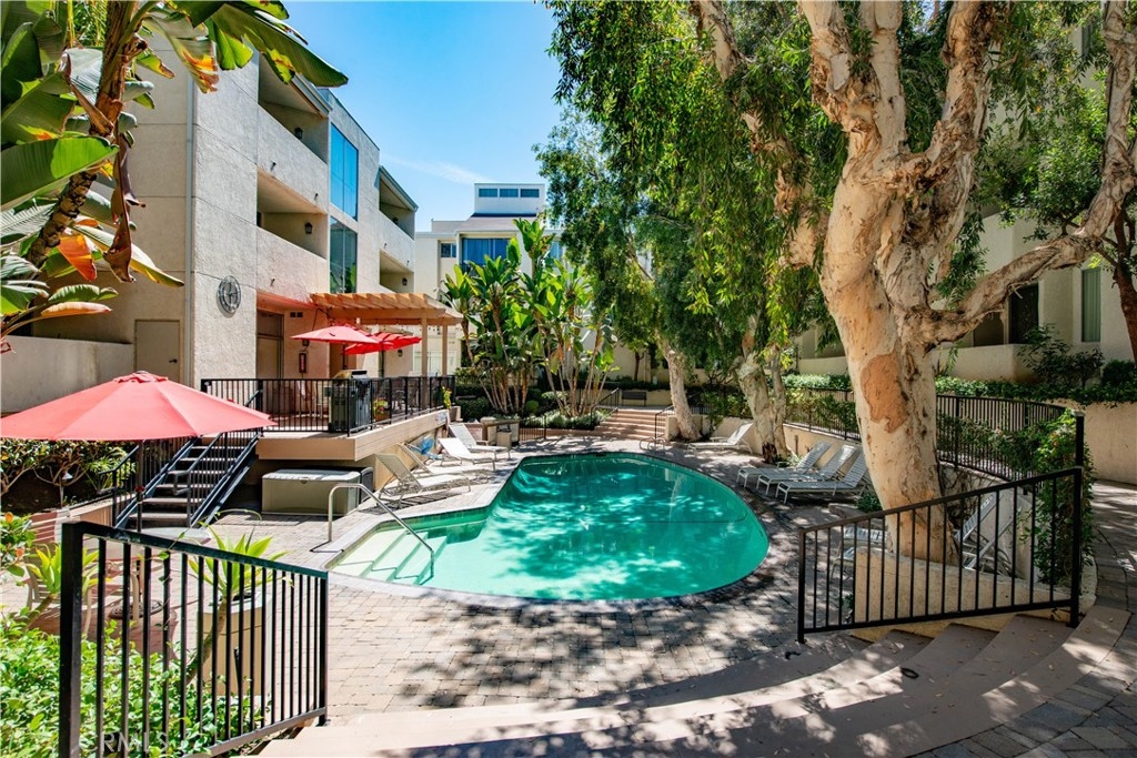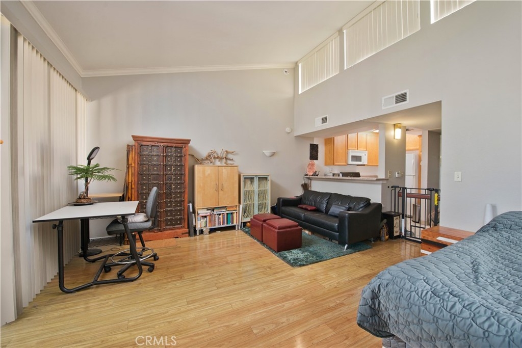 Top floor light-filled studio apartment. Lots of windows and high vaulted (9 ft rising to 14ft) ceilings and views of the tree off the balcony give the illusion you are living in a tree house. The apartment has many features throughout like crown molding, central heating and air, and laminate floors. The balcony is a good size for outdoor relaxation and has a big outdoor closet for extra storage. There is a gas fireplace in the center of the room dividing the living from the sleeping area. The bathroom area has a vanity section that could be used as a small work desk, away from the main living space. In one of the best buildings in the area, with amenities such as an underground parking spot close to the elevator/stairs to the unit gym, pool table, foosball, laundry, pool, and rentable rec room with kitchen for entertaining. The grounds of the building are beautiful with a relaxing waterfall and lush foliage. The HOA covers H20, trash, and gas. It is within walking distance to Ventura, shopping, dining, and transit. And is a short drive for commuting anywhere along the 101/405.