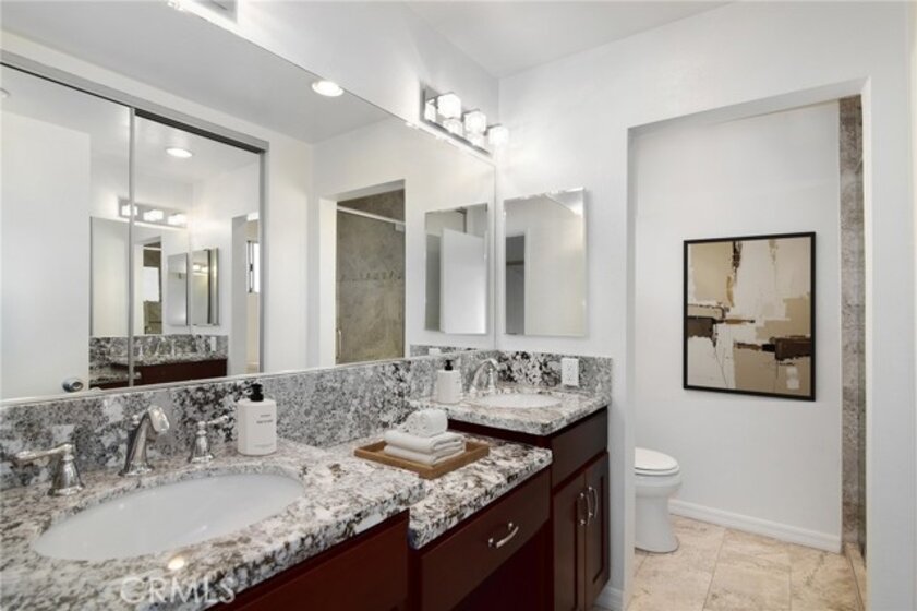 Beautifully renovated Encino condominium—move-in ready and waiting for you. This prime, front-facing corner unit with only one shared wall offers serene views of lush greenery—not your neighbor’s living room. Smooth ceilings, recessed lighting, and attractive flooring create a warm, welcoming entry. The stunning kitchen features a convenient service entrance, custom cabinetry, distinctive granite countertops, quality stainless-steel appliances (including refrigerator), and an exquisite tile backsplash. A large private balcony invites you to read, relax, or dine surrounded by nature. The primary bedroom is a true retreat, filled with natural light from a large window that frames tranquil exterior views. Mirrored wardrobes plus a walk-in closet provide excellent storage, while the beautifully remodeled en-suite bath boasts a striking walk-in shower. A spacious secondary bedroom and tastefully upgraded second bath complete the interior. At the heart of this well-maintained community, enjoy a refreshing pool and soothing spa. Includes two convenient parking spaces. All this and just a short stroll to Ventura Boulevard. Don’t miss this exceptional opportunity.
