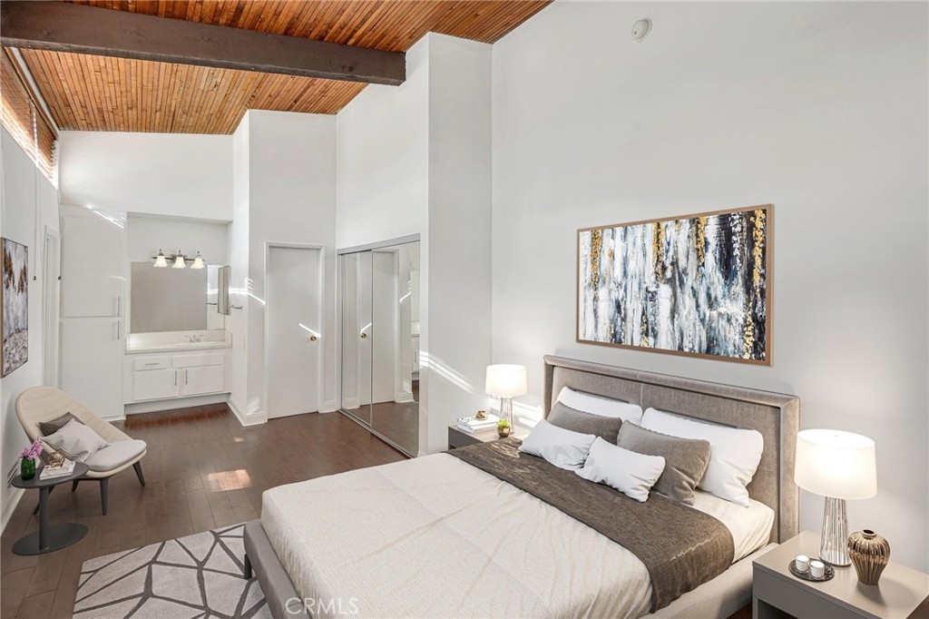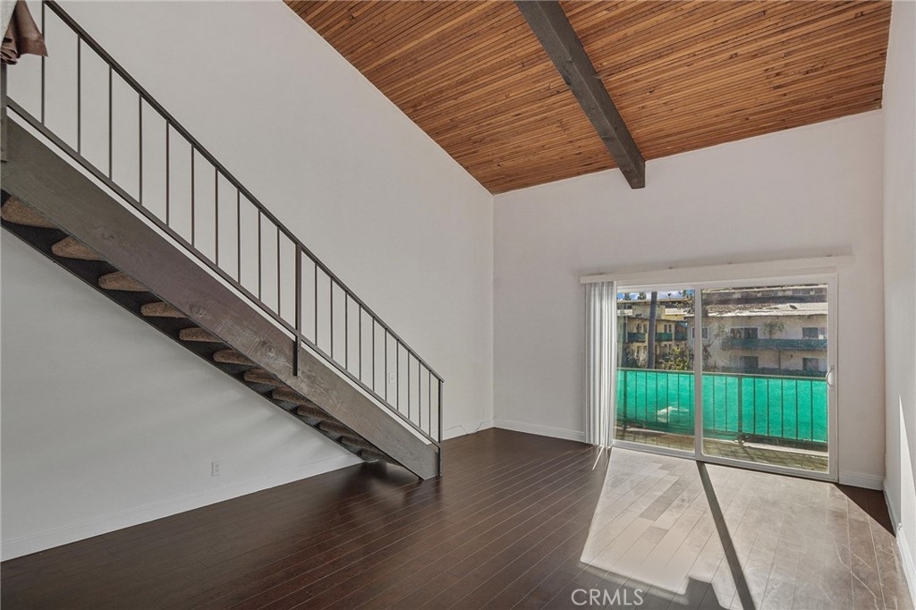 Light and bright, updated two-level condo in the heart of Encino. This top floor loft style penthouse has one of the best floor plans in the complex and is unique in that it has a bedroom, en-suite bath and walk-in closet on the second level. Enter to find an open concept layout with soaring wood ceilings and newer dark laminated floors throughout. The updated kitchen with stainless steel appliances and granite countertops flows seamlessly to the dining area and spacious living room. The living room also has direct access to a private balcony overlooking the pool area and mature trees. Both bedrooms are large and feature ample closet space. There is also a nook under the stairs that would be perfect for laundry and additional storage. The unit comes with 2 secured, assigned, subterranean parking spaces. Building amenities include a 24-hour security guard, resort-like pool and spa, 3 tennis courts, a gym, sauna, recreation room, BBQ areas, and a banquet room. HOA fees also include water, trash and insurance. Located moments to Ventura Blvd, top shopping, dining and near freeways for easy commuting. Welcome home!