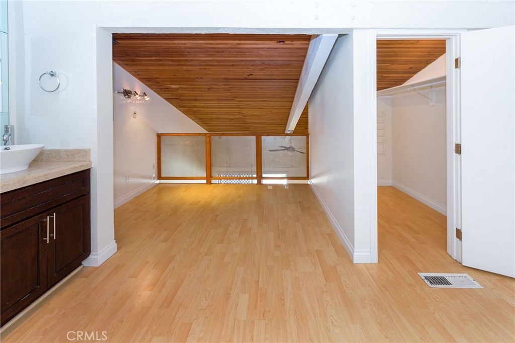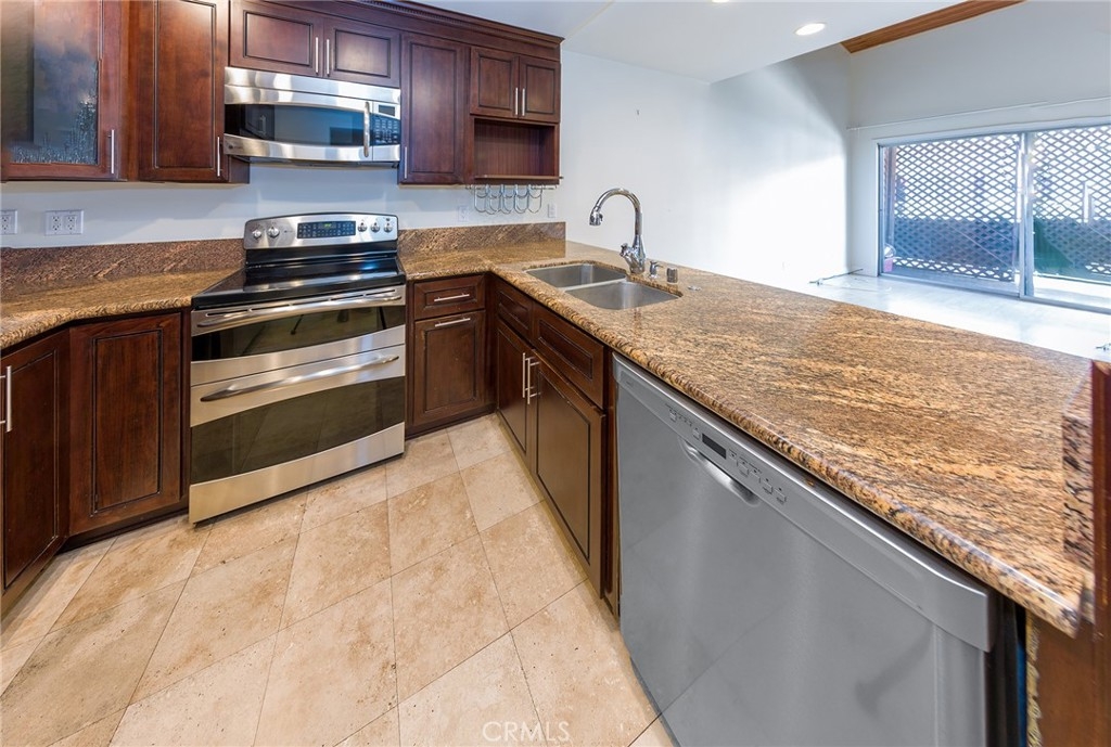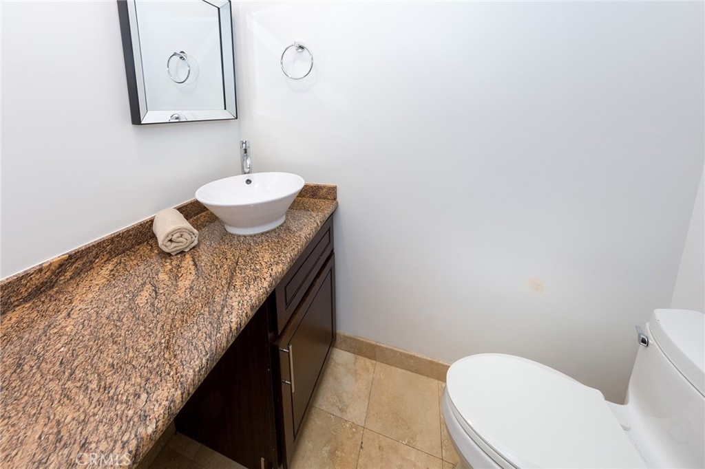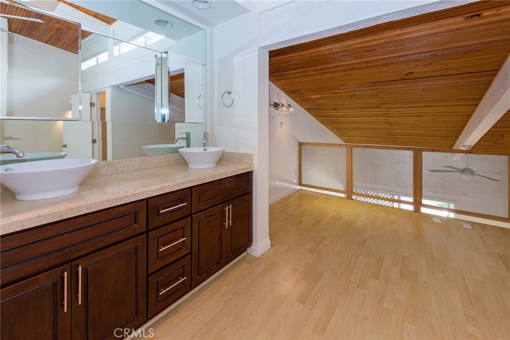 Encino Oaks 1 bedroom, 1.5 bath 3rd floor! Beautifully upgraded! Kitchen w/ granite counter tops, dark wood cabinets, tile floors, breakfast bar, open to living room! 1/2 bath w/ washer hook up! Spacious living room with west facing balcony! Upstairs bedroom w/ walk in closet, expanded area overlooking the living room with room for work area, recessed light. Full Bath upgraded, tile, double sink w/ granite countertop! Central air & heat! Community like a resort! Pool, spa, rec room, sauna, Tennis courts, men's & women's health club area! Amazing Encino location! So close to Balboa Park, Freeway, Ventura Blvd!