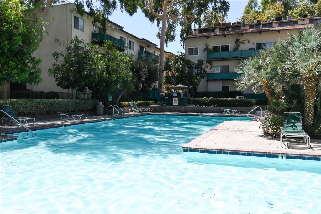 Remodeled over the years this Highly Sought after top floor 1 bedroom Loft unit located in building G away from the main street and freeway! Unit has soaring high ceilings with an open & airy living area and two ceiling fans. Upstairs bedroom is very spacious with master bath remodeled with slate tile. Very unique all-in-one European style washer/dryer installed in master closet area. Downstairs opens up with a half bath for guests just off the main entry, flowing to a roomy living area with laminate floors and a bold blue tile counter top in kitchen with a stainless steel built in microwave. Newer central air and heat with Nest programmable thermostat. Convenient double pane slider opens to balcony. Two side by side subterranean parking spots! Complex offers many amenities including secured access, sparkling pool/spa, clubhouse w/ pool tables,3 tennis courts, BBQ area, Men's & Women's separate exercise rooms, Laundry rooms on each floor . HOA also includes water, sewer, & trash. Convenient location close to 101 fwy, Ventura Blvd, shopping, restaurants and transportation! Investors welcome, Very nice and cooperative tenant willing to stay